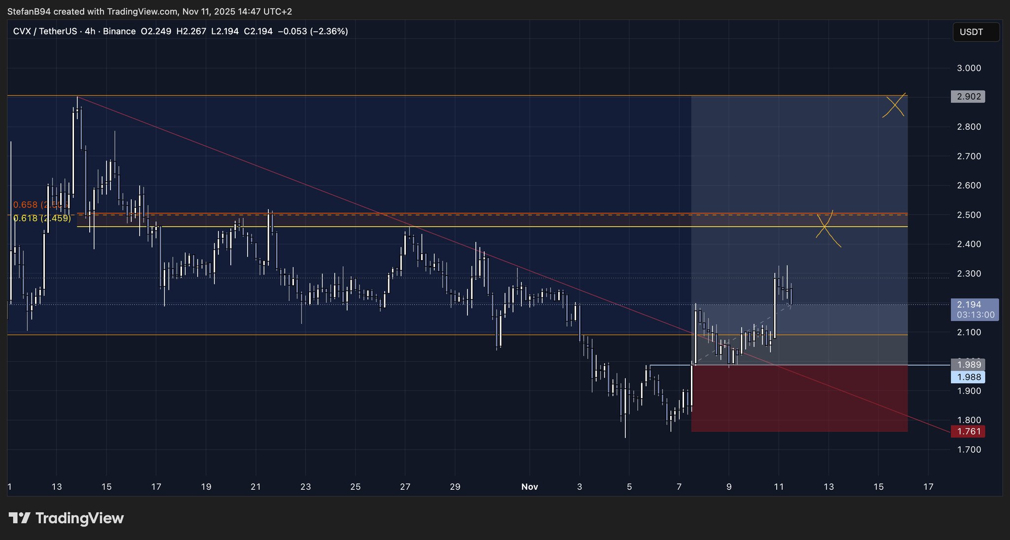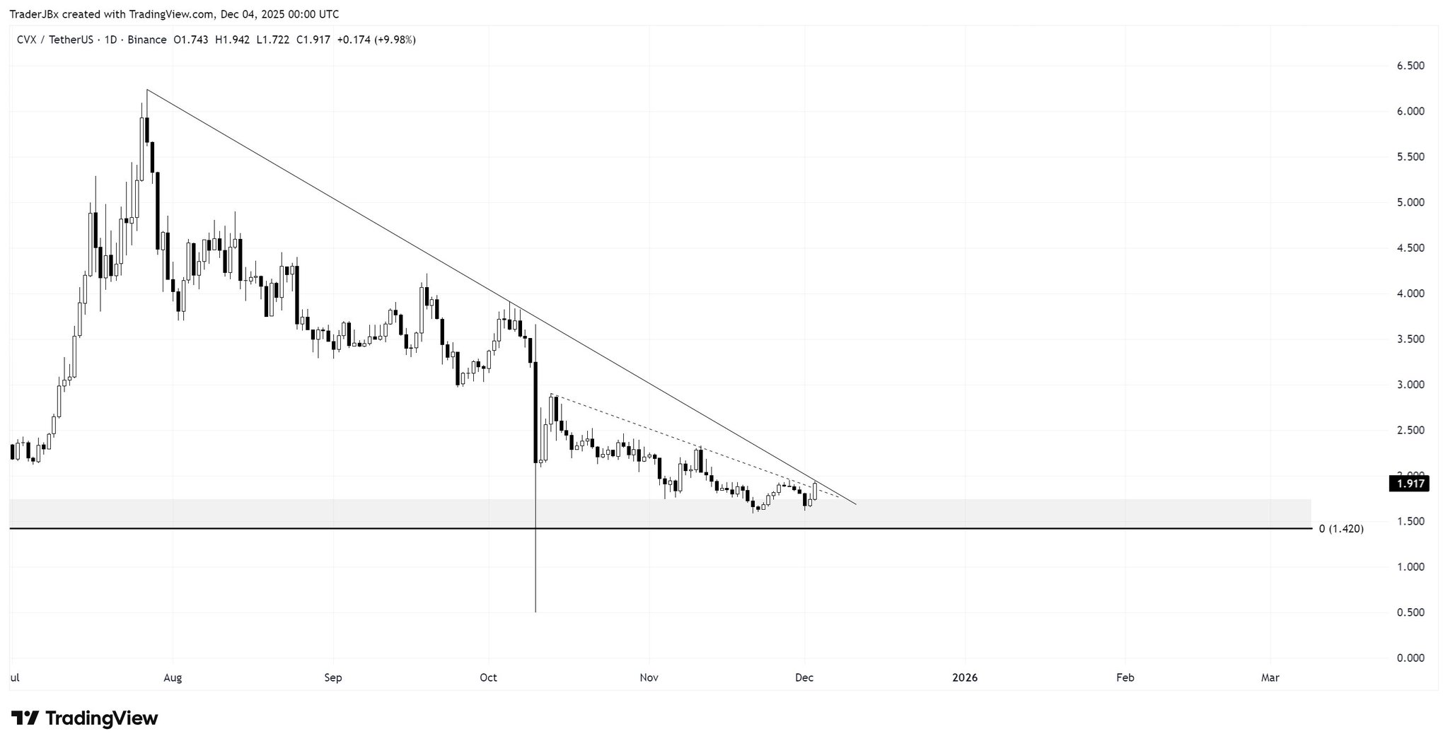 TraderJB TA_Analyst Trader A1.99K @TraderJBx$CVX - 72% discount from the yearly high. - Yesterday's close filled Nov 4's wick. - Price near range lows, compressing between the diagonal and 1D demand zone (gray). - Plenty of untapped liquidity above. Sorry, but it's impossible for me to be bearish here. #ConvexFinance https://t.co/vYnjWPVOsj
