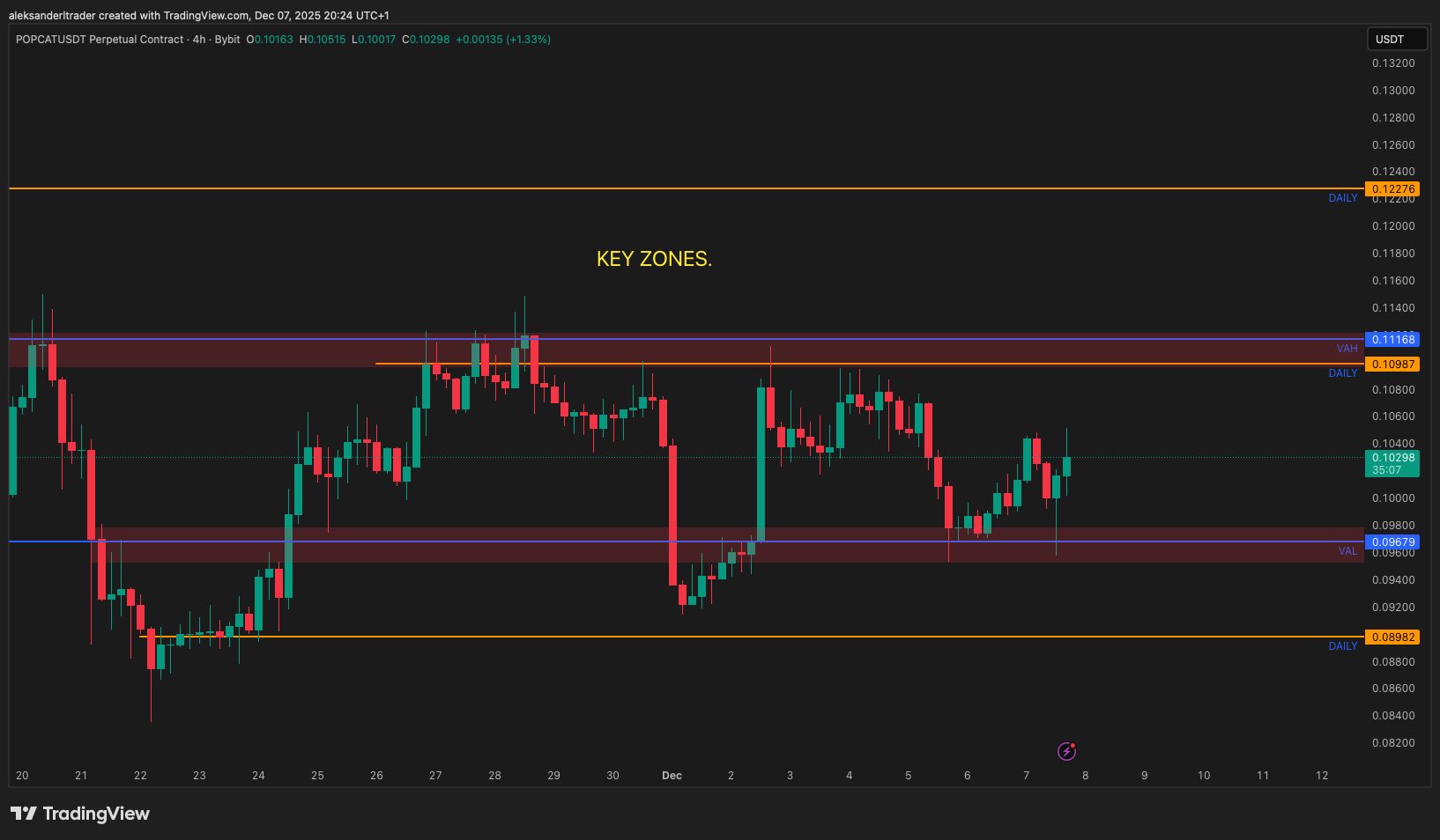 $POPCAT These two are my MAIN zones to watch! This coin has some nice moves, so absolutely something to watch for daytrading! ——————- To the upside. 1. 0.11 is key resistance to watch. May absolutely give a short. - VAH, daily and some highs of interest. ——————- To the downside. 1. 0.0967 can give a nice long! - VAL and a 4h level!