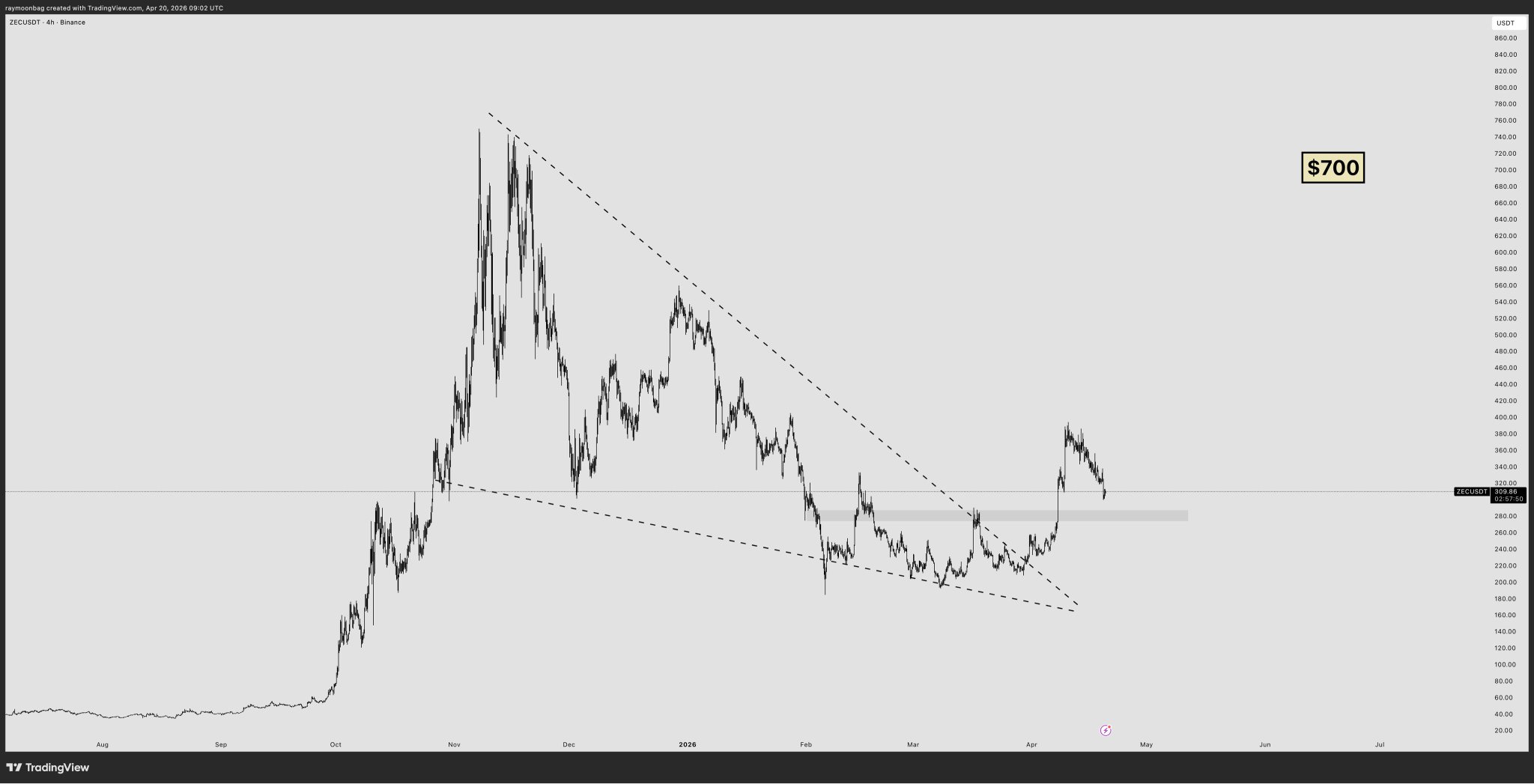 ZEC chart shows a breakout above the downtrend line, target price $700.