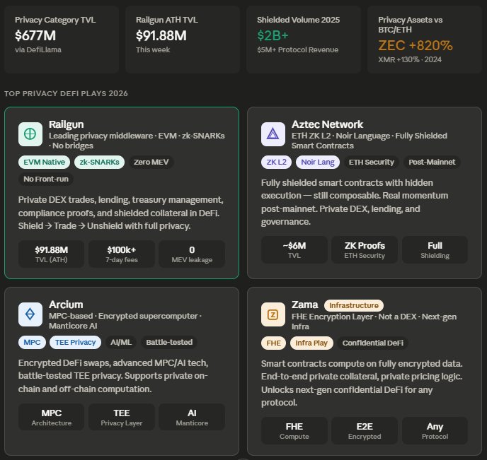 🧵Privacy-first DeFi just hits its breakout moment FYI, Privacy-first DeFi = How DeFi started eating the public-chain surveillance & MEV lunch as regulatory clarity increases. It is turning DeFi into a legitimate compliant private financial system that regulators are now embracing. As I pull up DefiLlama this morning, the entire Privacy category is sitting at $677M TVL. That’s active, shielded capital flowing into real DeFi primitives while regulators finally draw the line between “privacy” and “crime.” Institutions and power users are flooding in because public chains leak everything and nobody wants their positions front-run or doxxed. Real zk-SNARK shielded pools, programmable private smart contracts, and FHE computation where you prove compliance without ever exposing positions, balances, or trades. All these above are fully composable with existing DeFi liquidity, leveraged, and available to anyone with a wallet. Here’s what I’m seeing in real time: – Railgun’s shielded pools just hit a fresh ATH of $91.88M TVL this week. – Privacy-first protocols now command the entire $677M Privacy category on DeFiLlama, with Railgun alone printing $100k+ in weekly fees/revenue. – Broader privacy assets massively outperformed last year with such $ZEC up ~820%, $XMR up 130% while BTC/ETH lagged. – Shielded volumes on Railgun alone exploded to $2B+ in 2025, generating $5M+ in real protocol revenue. – Daily shielded DeFi activity has already touched ATHs while public-chain MEV and front-running keep leaking value. – The trend is still climbing as the CLARITY Act, SEC safe harbors, and global pro-innovation rules finally remove the old regulatory overhang. I’ve personally been shielding more of my DeFi book into these privacy layers. Because the UX is now straight-up better than public chains in the ways that matter: – Seamless shield → private trade/lend/govern → unshield with zero front-running or MEV leaks. – Prove regulatory compliance onchain without revealing anything. – And I can actually use shielded positions as collateral elsewhere in DeFi. The ZK proofs are battle-tested, oracles are solid, and liquidity is deepening fast, especially as institutions rotate in under clearer rules. This is DeFi doing what public chains literally can’t: permissionless, always-on privacy that regulators now treat as compliant infra instead of a red flag. Here’s my current top emerging plays: [1] @RAILGUN_Project - The leading privacy middleware for EVM chains. It uses zk-SNARKs to shield transactions and smart contract interactions without bridges or new L2s. Perfect for private DEX trades, lending, or treasury management. Users "shield" assets into private pools, interact confidentially, then unshield. It's deeply integrated into existing DeFi liquidity. Current TVL: ~$91.88M, with strong real usage: $100k+ in 7-day fees/revenue. [2] @aztecnetwork - The Pure Programmable Privacy Play Ethereum’s ZK L2 for fully shielded smart contracts via Noir language. Private DEXes, lending, confidential governance, all with Ethereum security. TVL ~$6M but post-mainnet momentum is real. I’ve been testing private position management here; execution stays hidden while still composable. [3] @Arcium - MPC-based decentralized confidential computing network Encrypted supercomputer for private onchain/off-chain computation. Mainnet Alpha live with first app Umbra (encrypted DeFi/swaps). Inpher acquisition (advanced MPC/AI tech); C-SPL confidential tokens + partnerships; Manticore AI protocol post-mainnet. [4] @zama - The FHE Infra Powering the Next Leap Not a DEX but the encryption layer letting smart contracts compute on fully encrypted data. Unlocks end-to-end private collateral ratios, pricing, and logic. The infrastructure play I’m watching closest for the next wave. Other privacy protocols that might be the infra for privacy-first DeFi: [1] @nillion: Decentralized "blind computation" network using Nil Message Compute for processing encrypted data without decryption or node-to-node messaging. [2] @SecretNetwork: L1 blockchain for confidential smart contracts via TEEs, enabling private data + execution. [3] @OasisProtocol: Privacy-first chain with confidential EVM ParaTime using TEEs + ROFL framework for verifiable off-chain private logic. [4] @iEx_ec: TEE/Intel TDX-powered programmable privacy layer for composable on/off-chain confidentiality. Honorable mentions I’m watching closely: Broader EVM privacy middleware builders expanding Railgun-style shielding across chains. So I can confidently say privacy-first DeFi beats public transparency for capital protection and execution quality, exactly what the new regulatory clarity was built for. The flows prove serious users and institutions are already participating through the privacy rails they now trust. Privacy-first DeFi went from niche to double-digit relevance in months while the rest of DeFi faced the usual transparency tax. That tells me the product-market fit is real. I believe the real rotation is privacy-first everything, traded compliantly, by anyone.