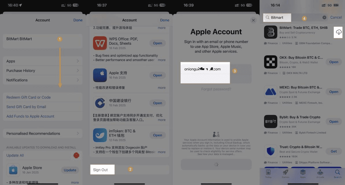 • Step3-4: Log in to the newly registered Apple ID and enter [Bitmart] to search and download