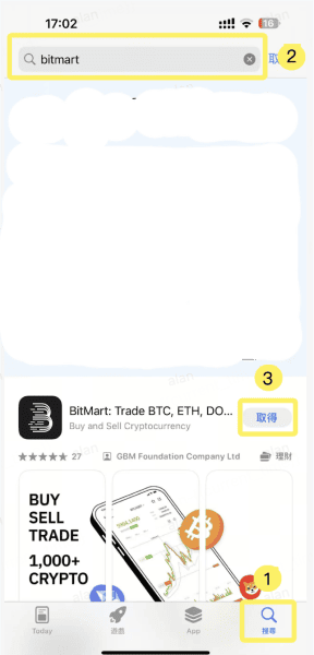 • 步骤六:登录成功 >> 点击 "搜索" >> 输入 "币市" >> 点击 "获取"