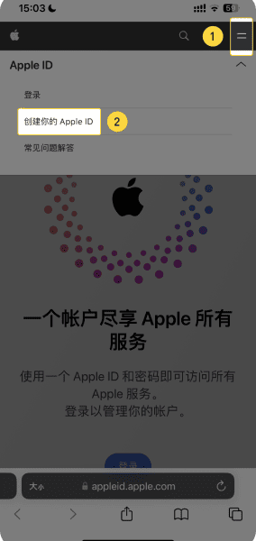 • 步骤二:点击右上角下拉菜单 >> 选择"创建你的 Apple ID"