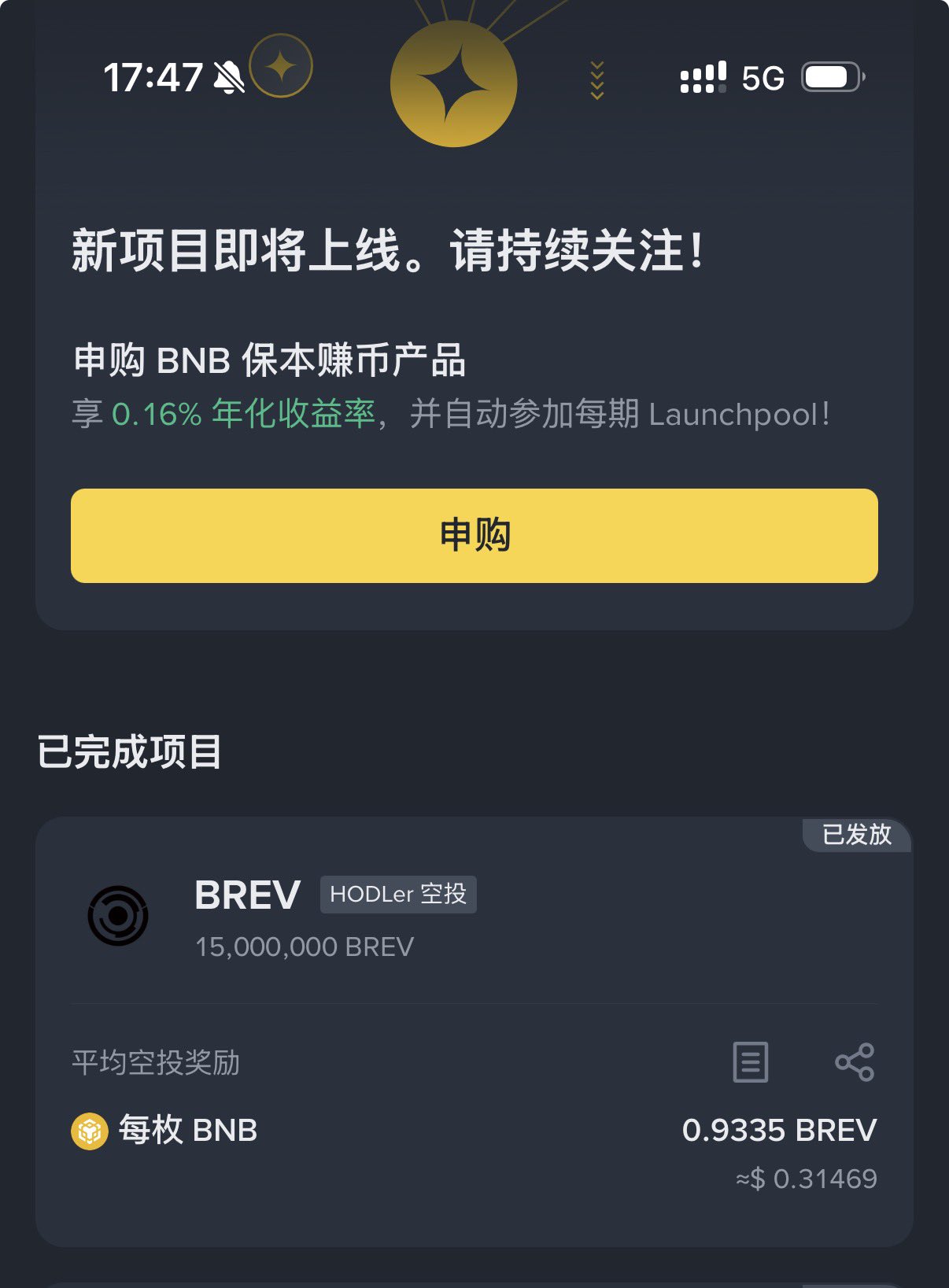 47 18 12.63K أصلي >اتجاه BREV بعد الإصدارصاعدThe author is cautiously optimistic about the airdrop token BREV and will decide the holding strategy based on business data; also bullish on BNB.