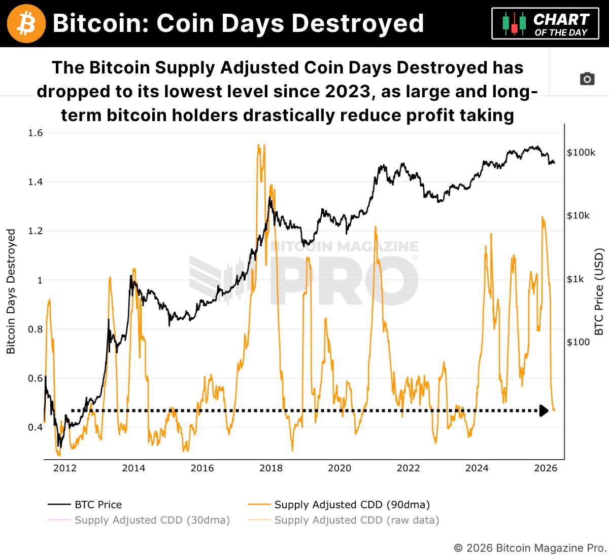 BTC Coin Days Destroyed hits a new low for 2023, long-term holders significantly reduced profit-taking, indicating reduced selling pressure.