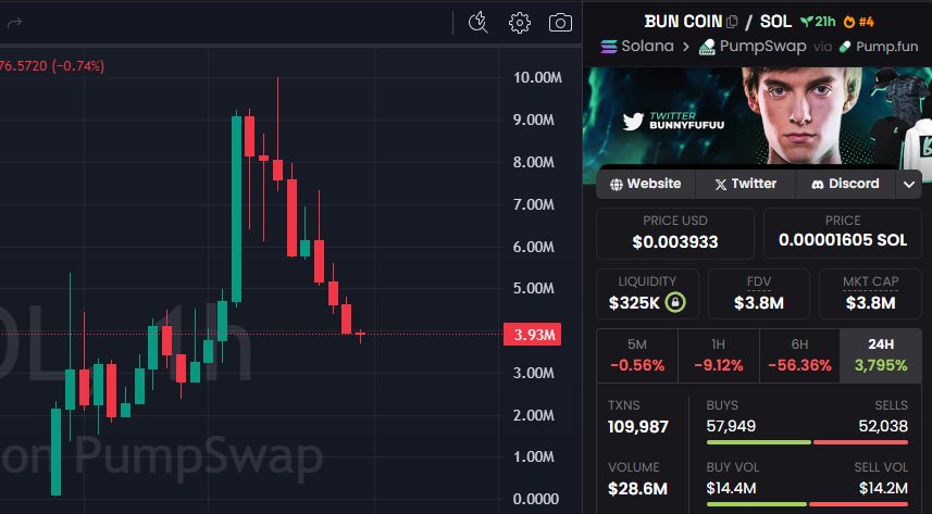 The tweet and chart indicate that BUN COIN has completed a pump-and-dump, warning investors to avoid FOMO buying.