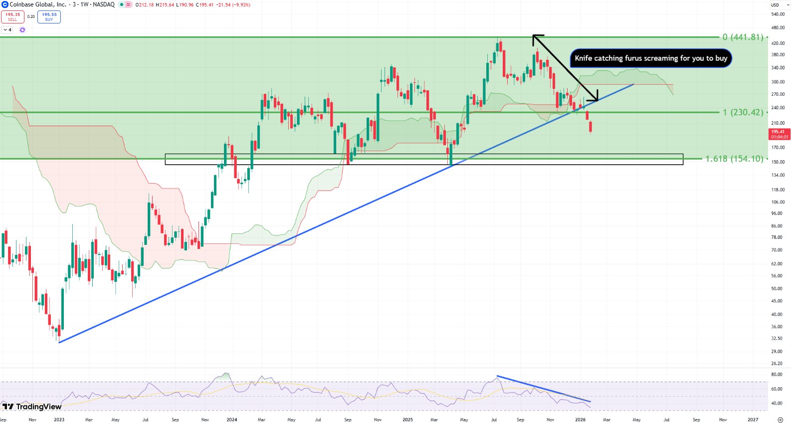 $COIN approaching monthly Ichimoku cloud and 0.618 log Fibonacci confluence https://t.co/zFhz4LfnS9