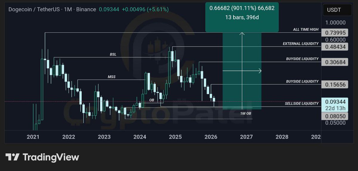 DOGE has completed its macro correction, is in an accumulation zone, with a long‑term target price of $1 and a 400‑900% upside potential.
