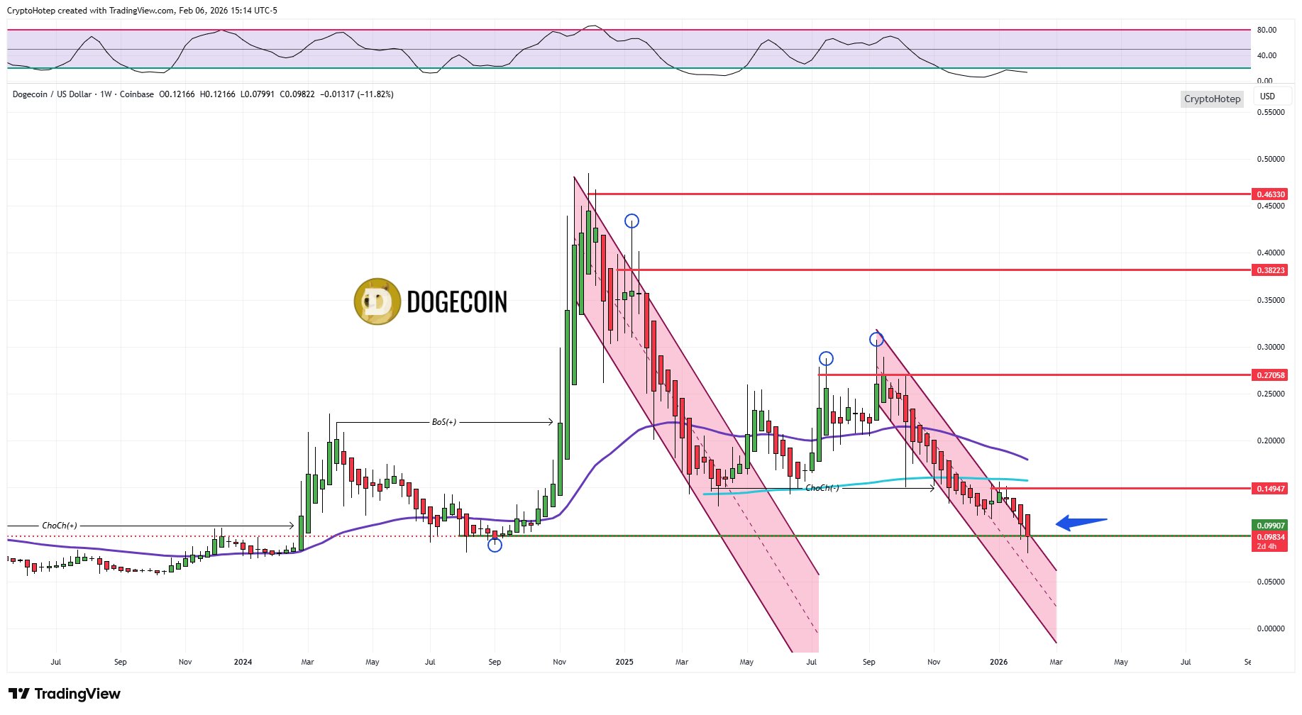 DOGE at $0.10 is seen as a good buying opportunity, the chart shows the price is near potential support.
