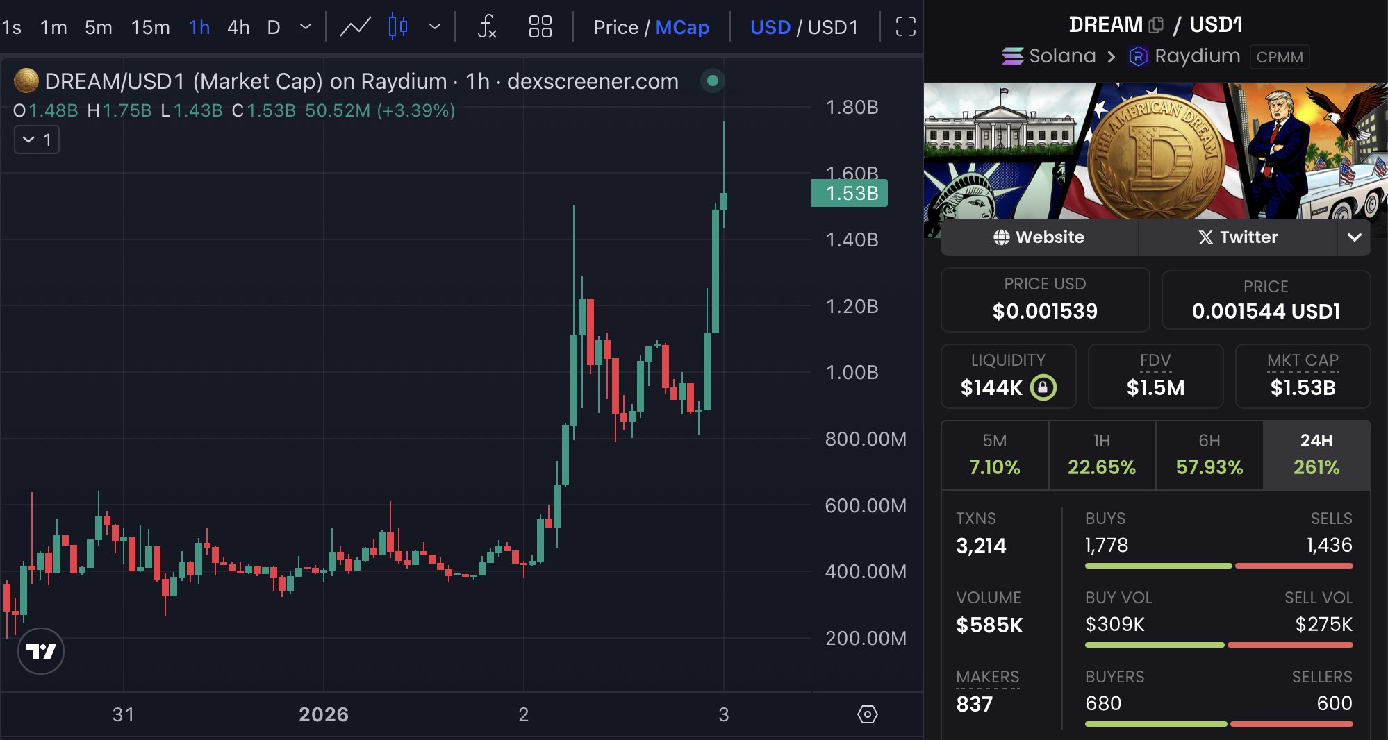 $dream recovers from $15k valuation floor to hit $1.5m market cap, solidifying lead position in the usd1 ecosystem with 2,000 new community members added in 96 hours.