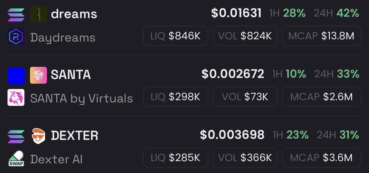 $dreams $santa $dexter are on my radar, which ones are you watching? There are some on eth but they have almost $0 volume https://t.co/Lvsyojx8Hs