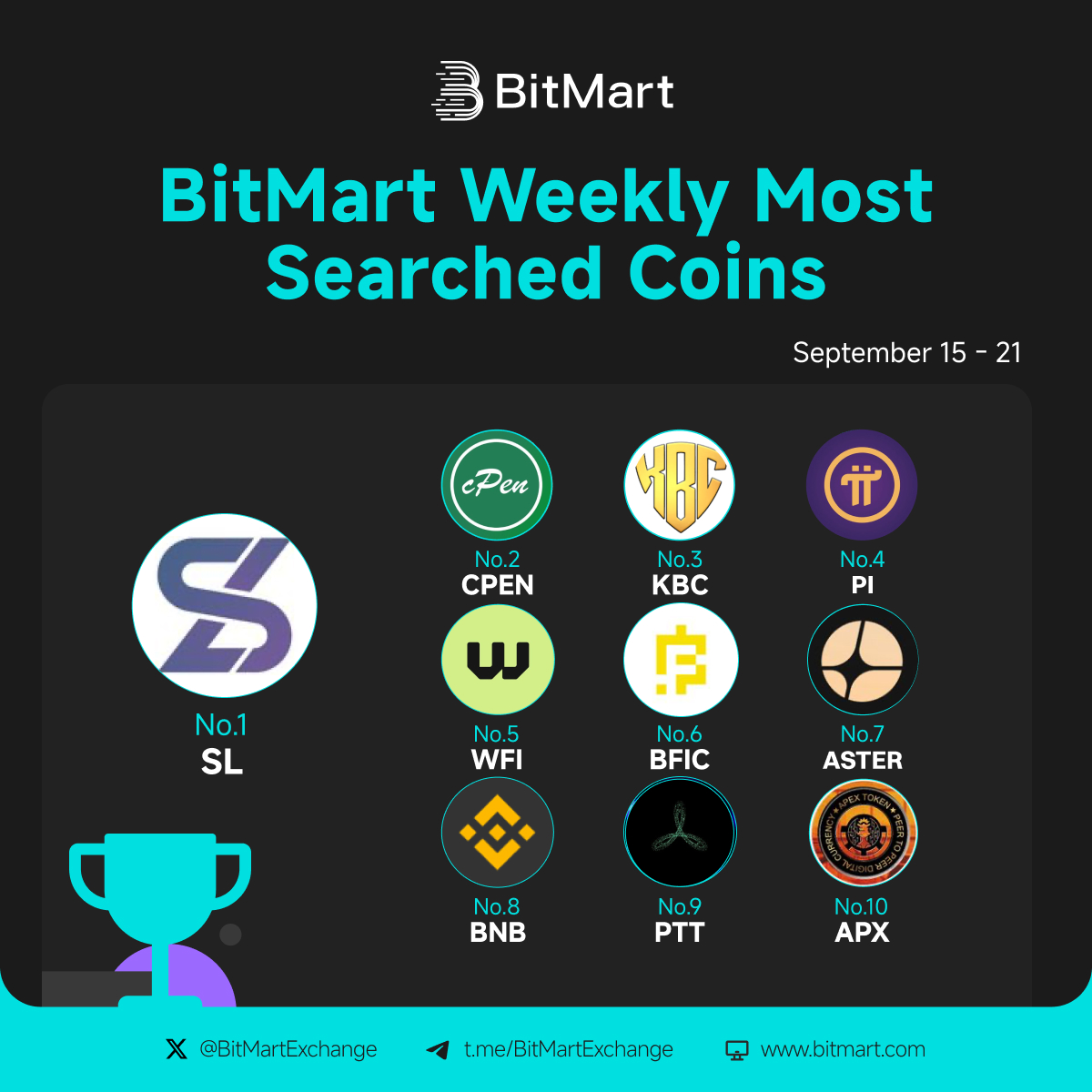 BitMart announced its weekly most searched coins list for Sep 15-21, with SL leading, and CPEN, KBC, BFIC, ASTER, etc., worth noting.