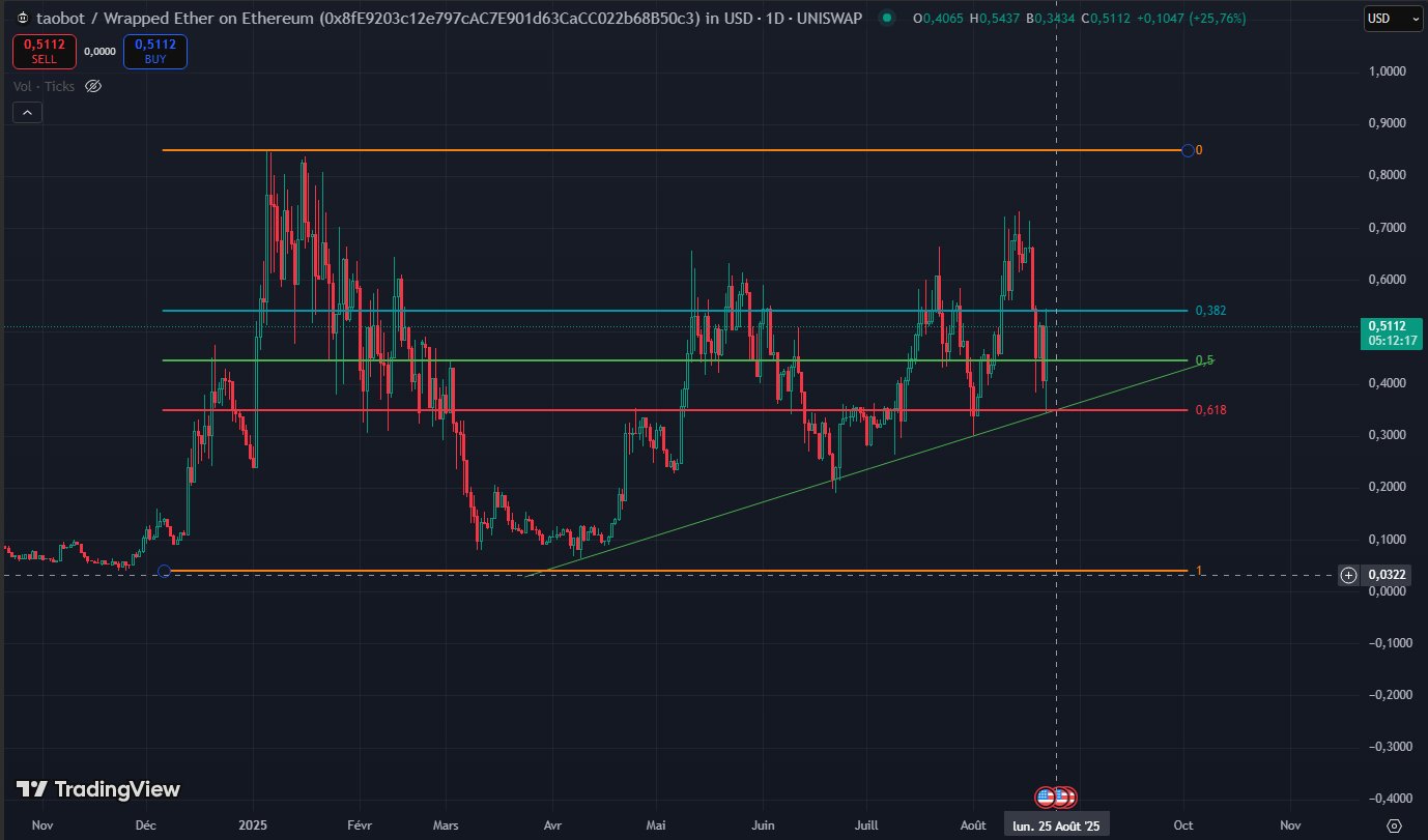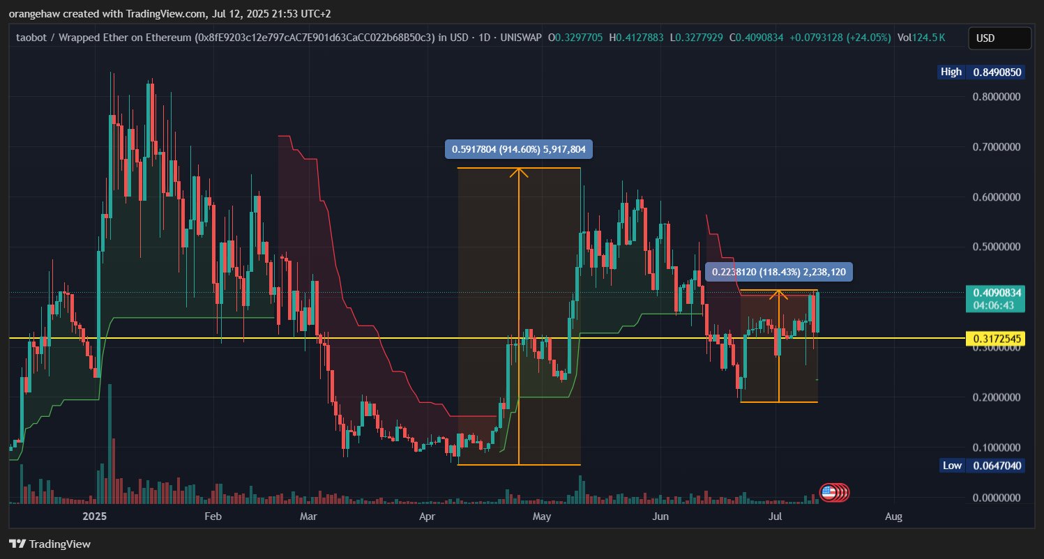 TAOBOT surged 24% today, showing strong upward momentum as a leveraged version of TAO.
