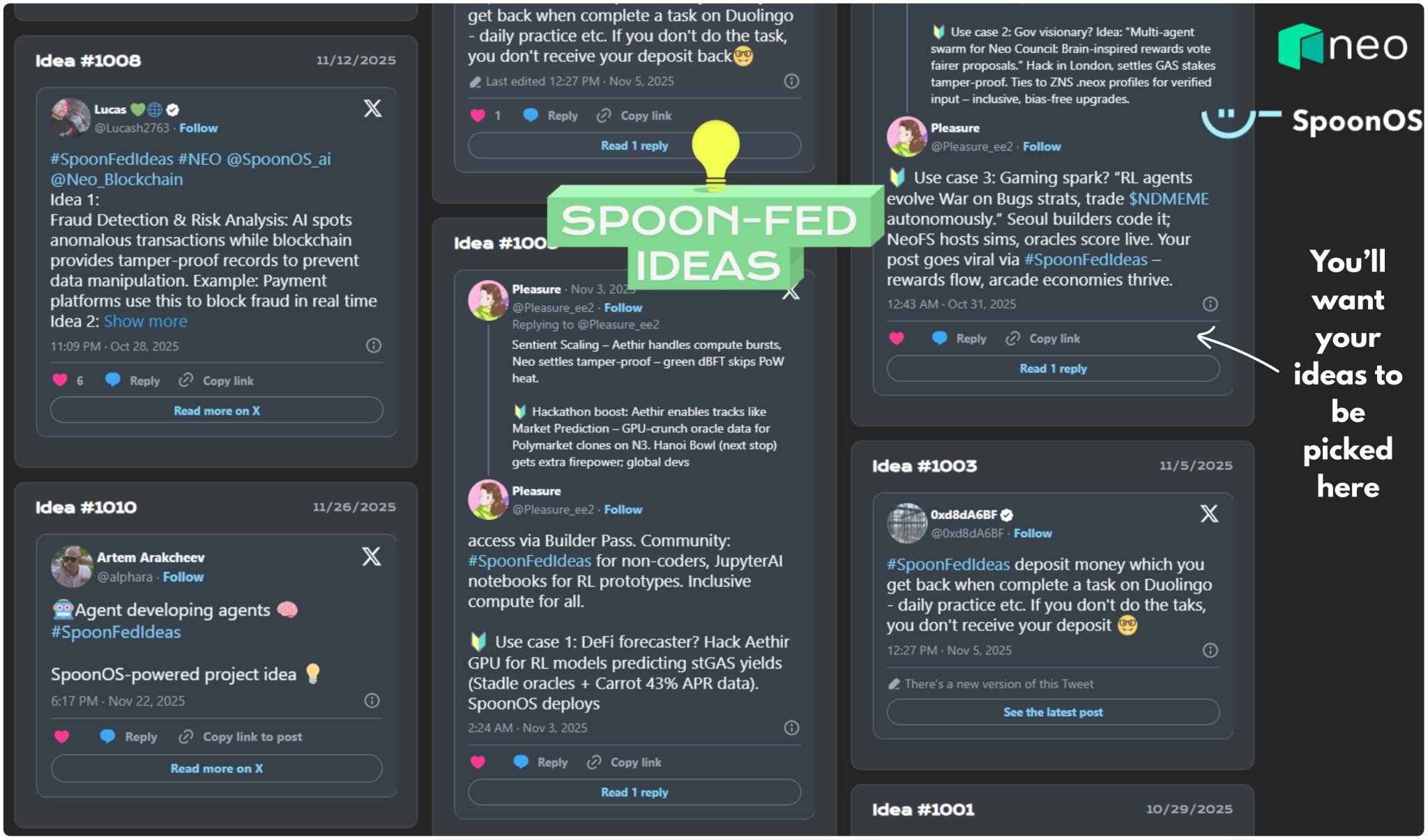 🌱Smartcoded.fogo (Mainet $/acc) Educator DeFi_Expert A5.67K @smartcodedI stumbled on something interesting today from @SpoonOS_ai x Neo, and honestly… it got me thinking. Most hackathons feel like dev-only territory. If you can’t code, you just watch from the sidelines. But this one flips the whole model. It’s called the Scoop AI Hackathon, and they paired it with something even cooler, the #SpoonFedIdeas campaign. And the idea behind it is simple, non-devs bring the ideas, developers turn them into real products. That’s how Web3 and AI should work. Let me break it down the way I understood it: • It’s a global hackathon running across 8 cities with a 100k prize pool • Anyone can join, even if you’ve never written a line of code • All you do is drop your idea on X • Devs browse the idea pool and choose what they want to build • If your idea wins, you also get paid To join, it’s literally just: → Post “What I would build on SpoonOS is…” → Write your idea clearly → Add #SpoonFedIdeas If the moderators approve it, your idea goes straight to the official campaign page where all builders can see it. And here’s where it gets interesting for creators like us: Devs aren’t looking for hype. They’re looking for ideas that are: • practical • buildable • actually useful • backed by a supportive audience If your idea gets strong engagement (likes, replies, reposts), it has a higher chance of being picked. And the reward structure is honestly fair: • If a builder team picks your idea • And they win first place at any Scoop AI event • You get $150 in GAS • The devs get a $100 bonus on top of their prize Win for the idea person. Win for the developer. Win for the ecosystem. I like this model because it finally gives non-dev creators a real seat at the table. Your voice and your understanding of what users want actually matter here. I’m joining this myself and I’ll be sharing my own SpoonOS agent idea in my next post under #SpoonFedIdeas. If you’ve ever told yourself, “I wish someone would build this,” this is the moment to actually share it. Let’s see which ideas get picked and how far they go.