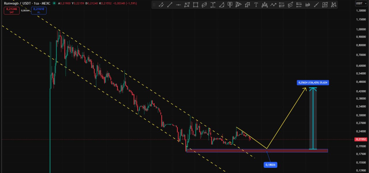 Although the author believes Runwago trading is high-risk, the chart shows it formed a local bottom at $0.18, potentially leading to a rebound to $0.44.