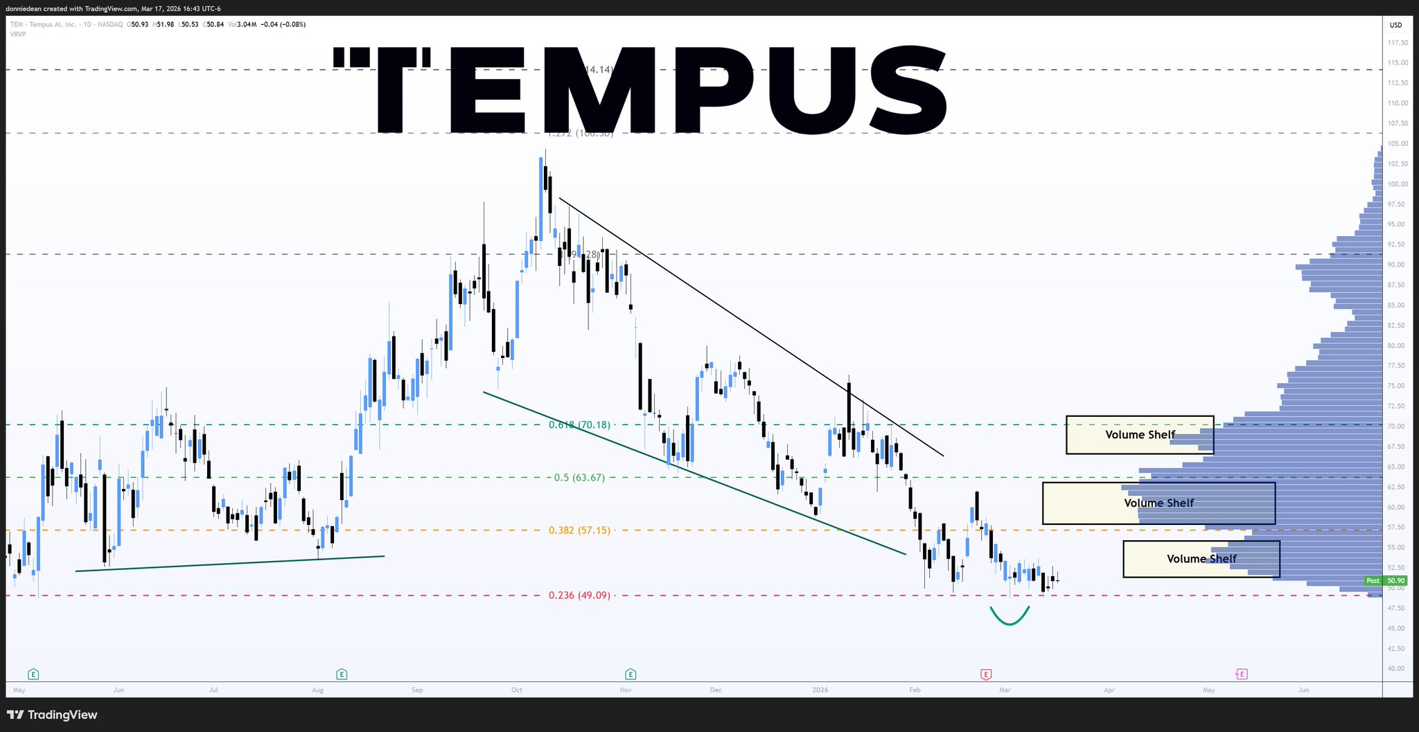 $TEM Tempus AI - At lower support near $49 and so far is holding. Price needs to get above $54 at the resistance trendline and at the volume shelf to move higher. https://t.co/2g42894txs