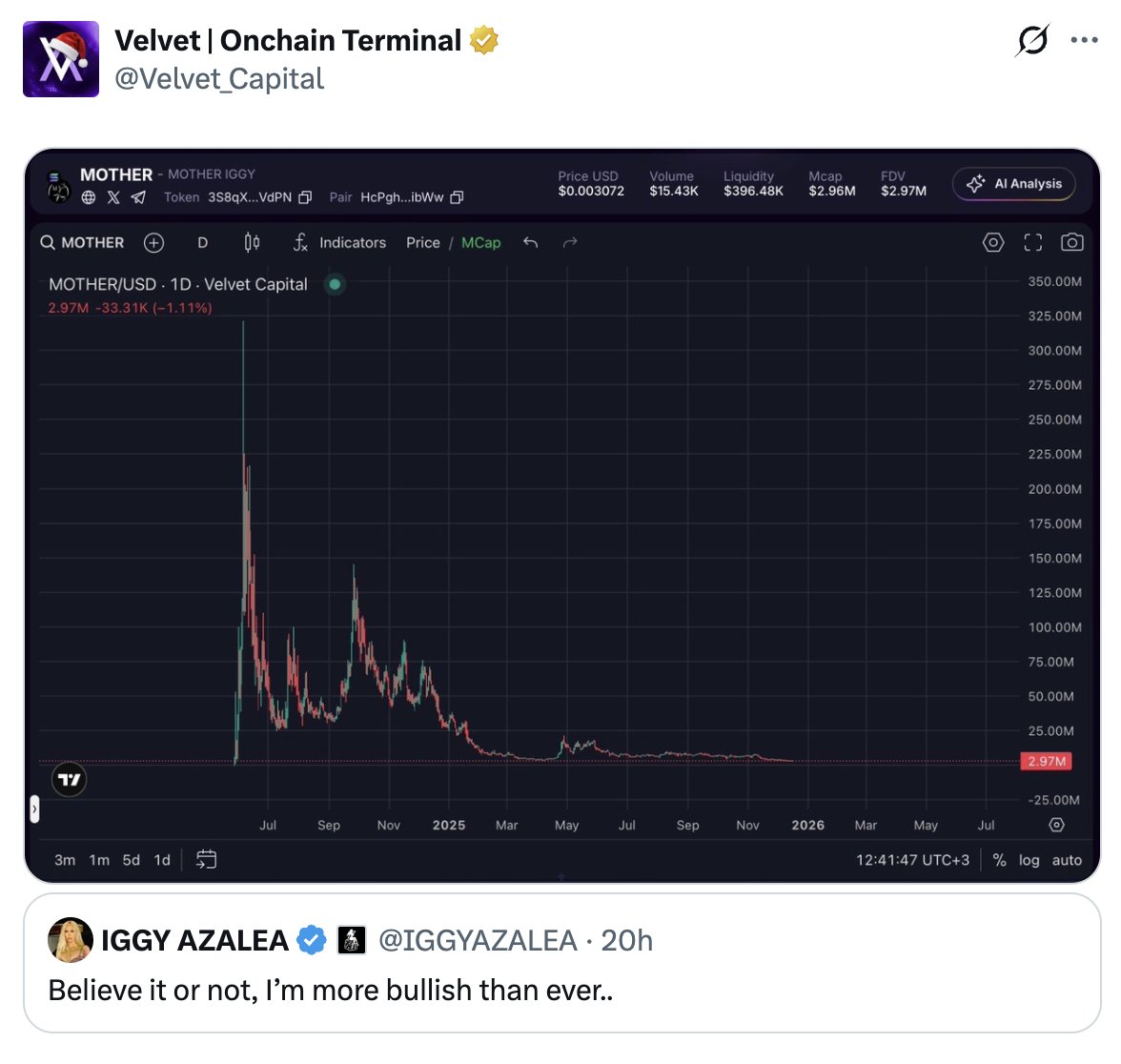 The tweet praises Velvet Capital for exposing the sharp decline of the celebrity token MOTHER and mocks Iggy Azalea's ongoing bullish remarks.