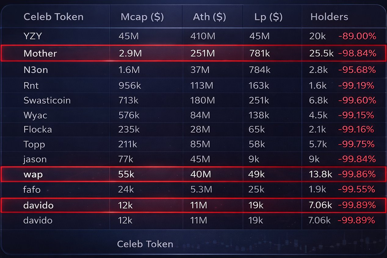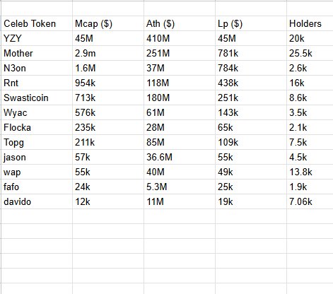Celeb Coins once worth tens or hundreds of millions now sit on 50k to 250k liquidity.