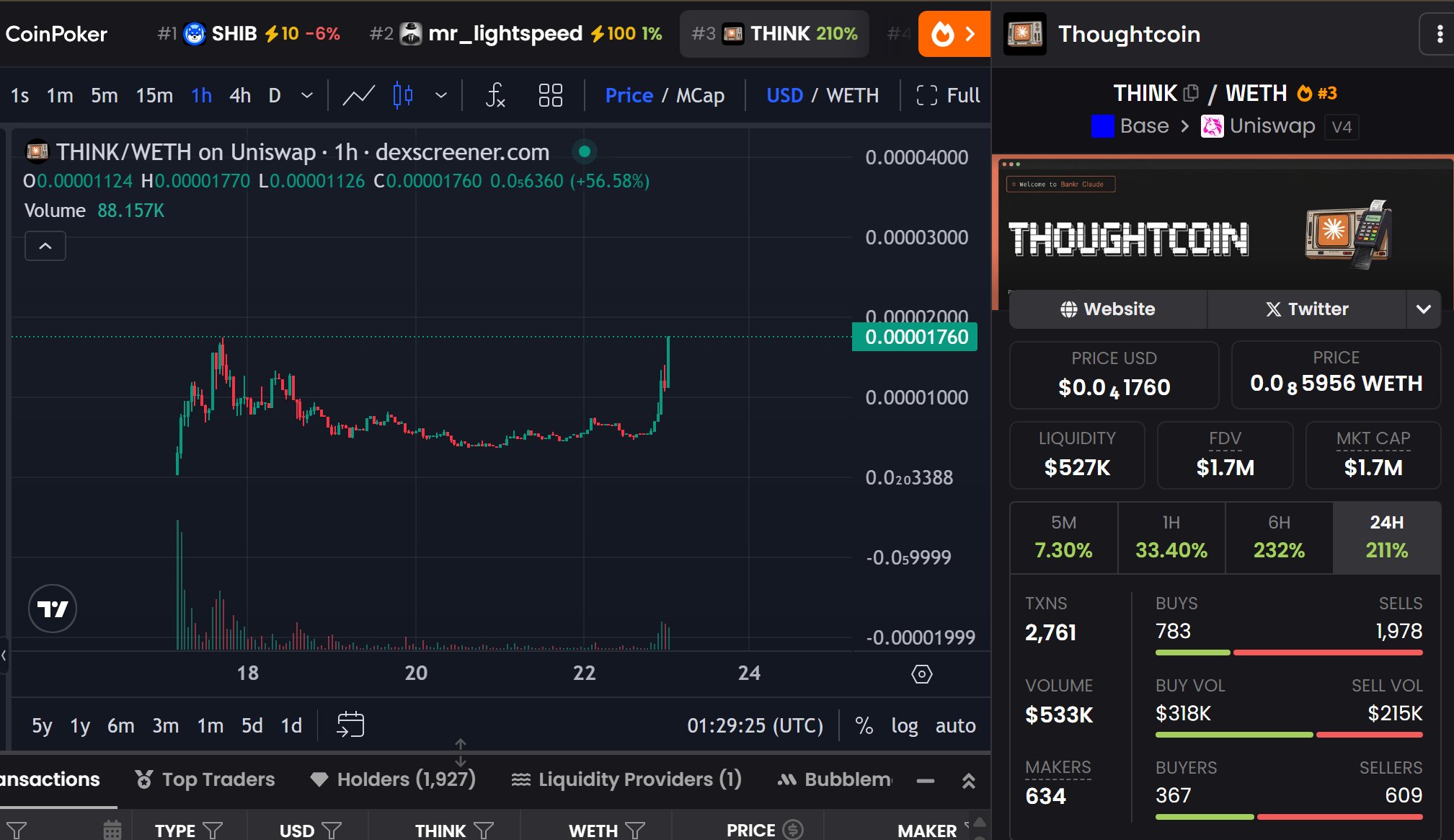 THINK token shows signs of bottoming out and rebounding in the Base ecosystem, with a sharp price increase.