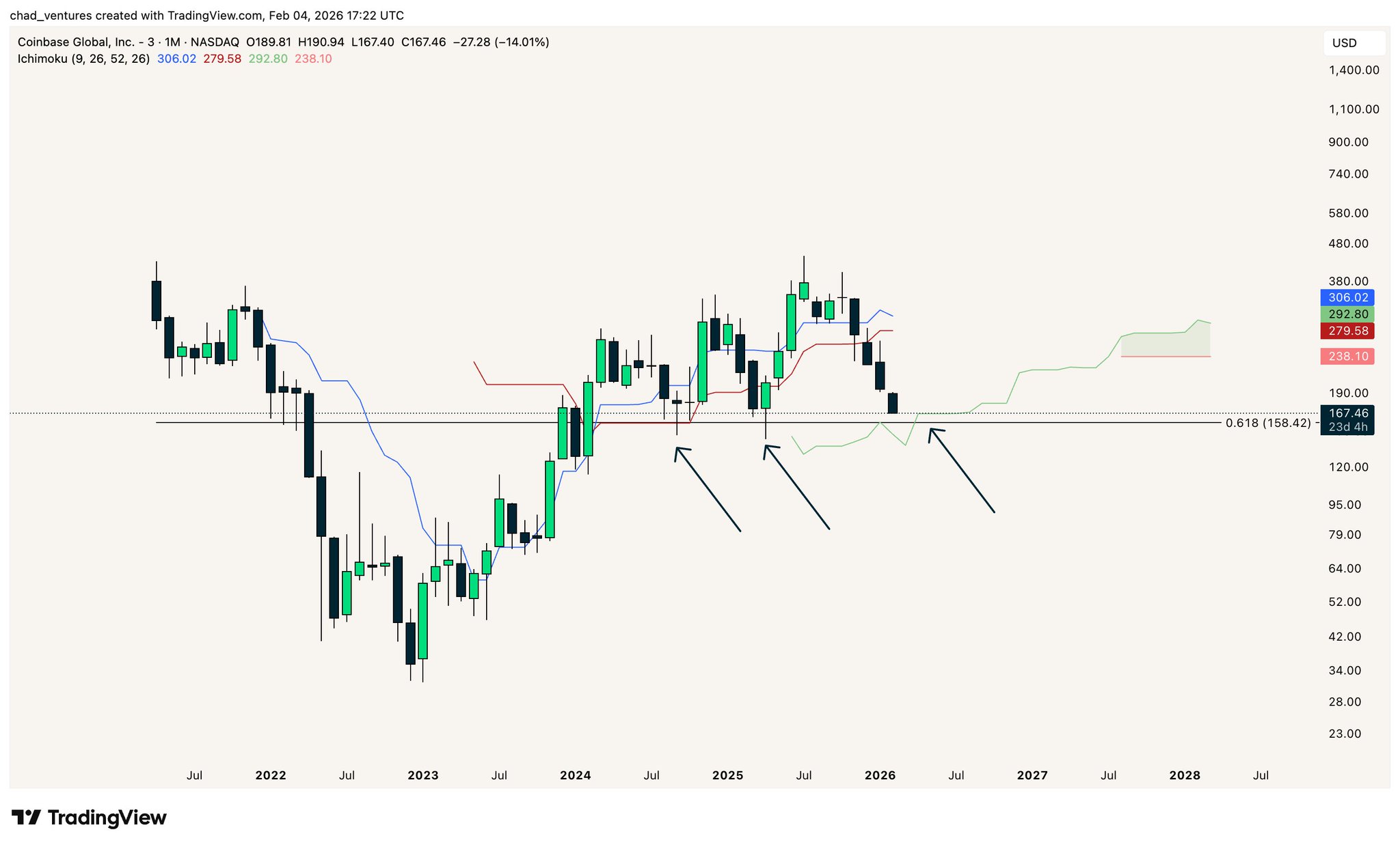 $COIN is now sitting right at the monthly Ichimoku cloud.