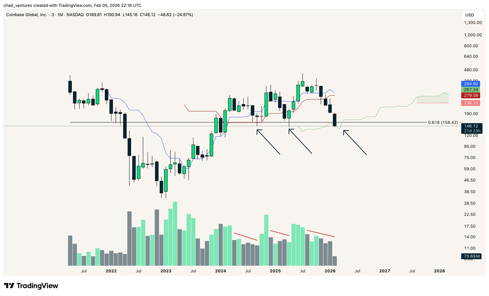$COIN approaching monthly Ichimoku cloud and 0.618 log Fibonacci confluence https://t.co/zFhz4LfnS9