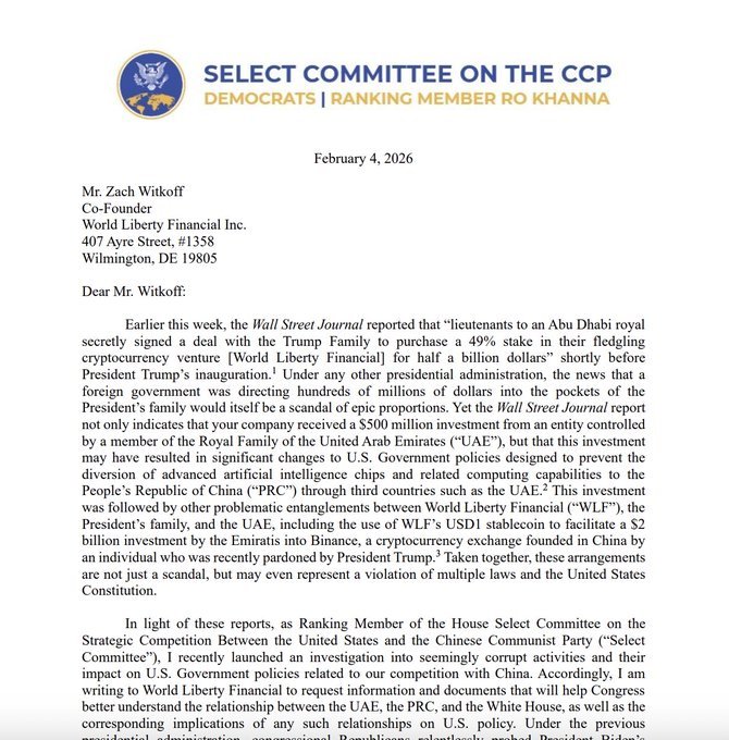 🚨 JUST IN: A senior House Democrat opens a congressional probe into Trump-linked crypto project World Liberty Financial (WLFI) after reports of a $500M UAE royal-family-tied investment.