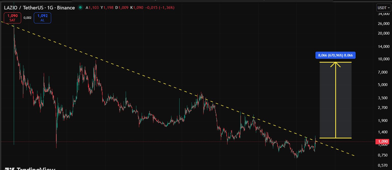 The tweet and chart show LAZIO breaking out of a long-term downtrend line, with strong short-term gains, indicating a potential significant future rally.