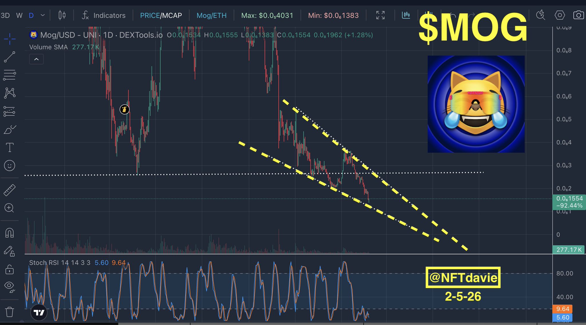 We see a falling wedge pattern like many of the alts which is signifying seller exhaustion. At 0.0₆15 which was about $60 million market cap, $MOG looked too good to me not to jump in.