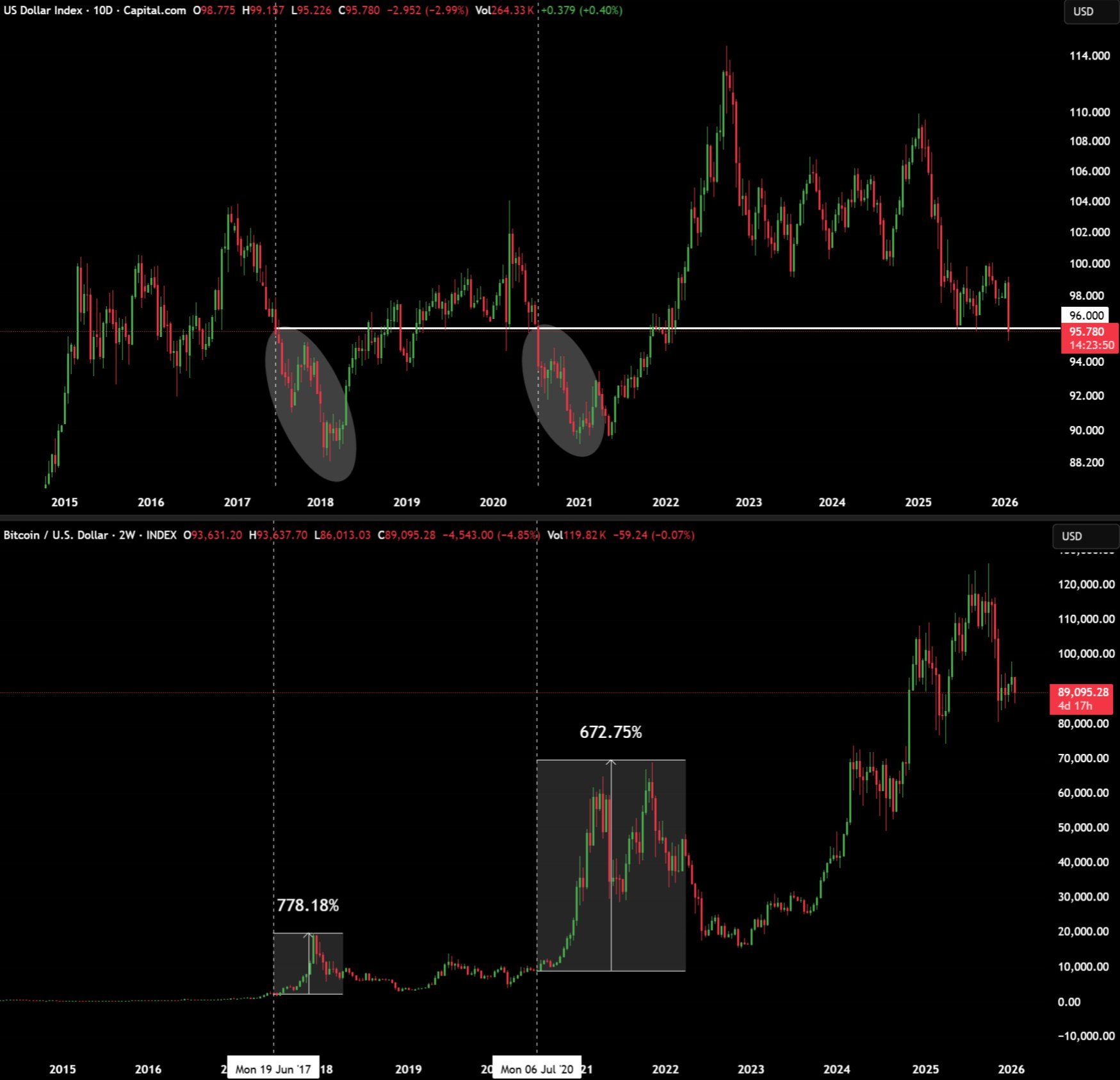 DXY fell below 96, history suggests BTC will see a strong rally.