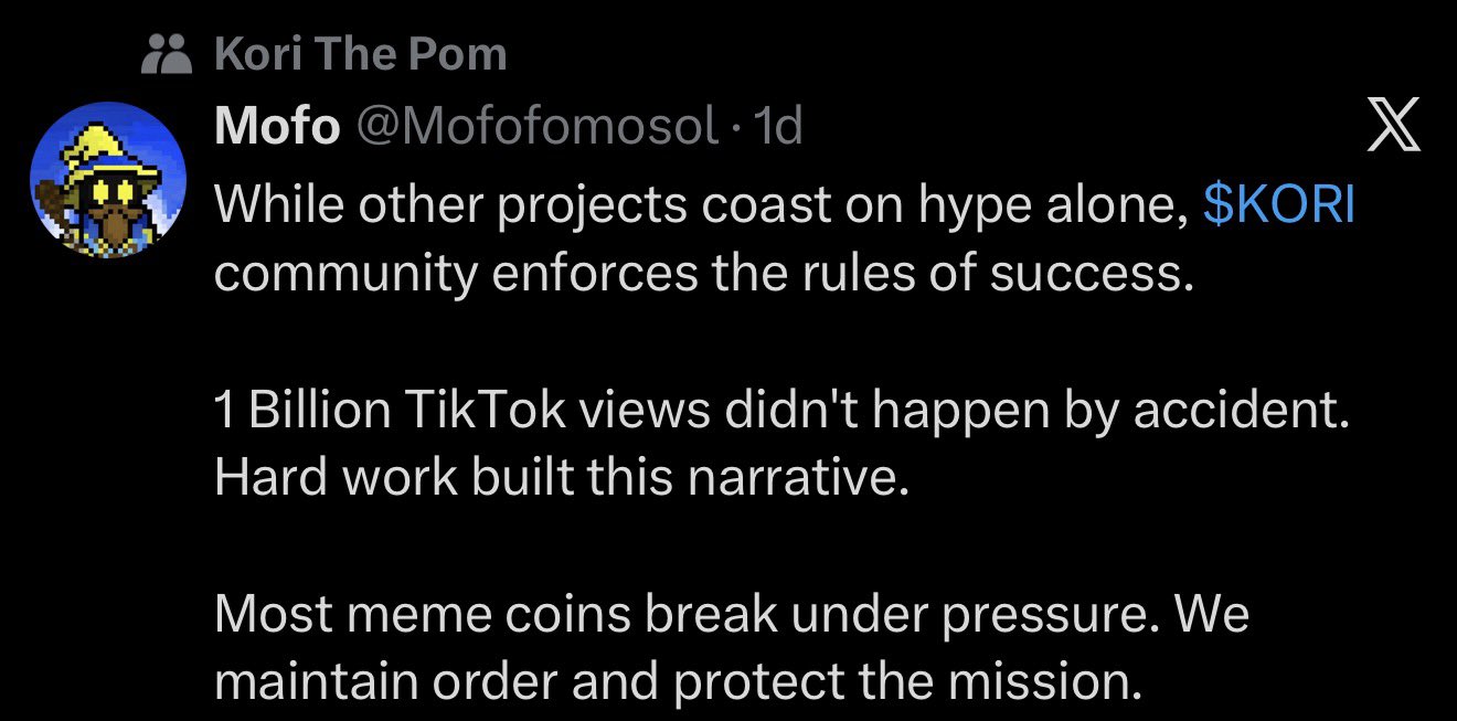 a resurgence of mindshare for $kori is being logged. the spike is fueled by a capital rotation from $johnny due to scam allegations against @milerozu, combined with a renewed "tiktok algo" marketing push.