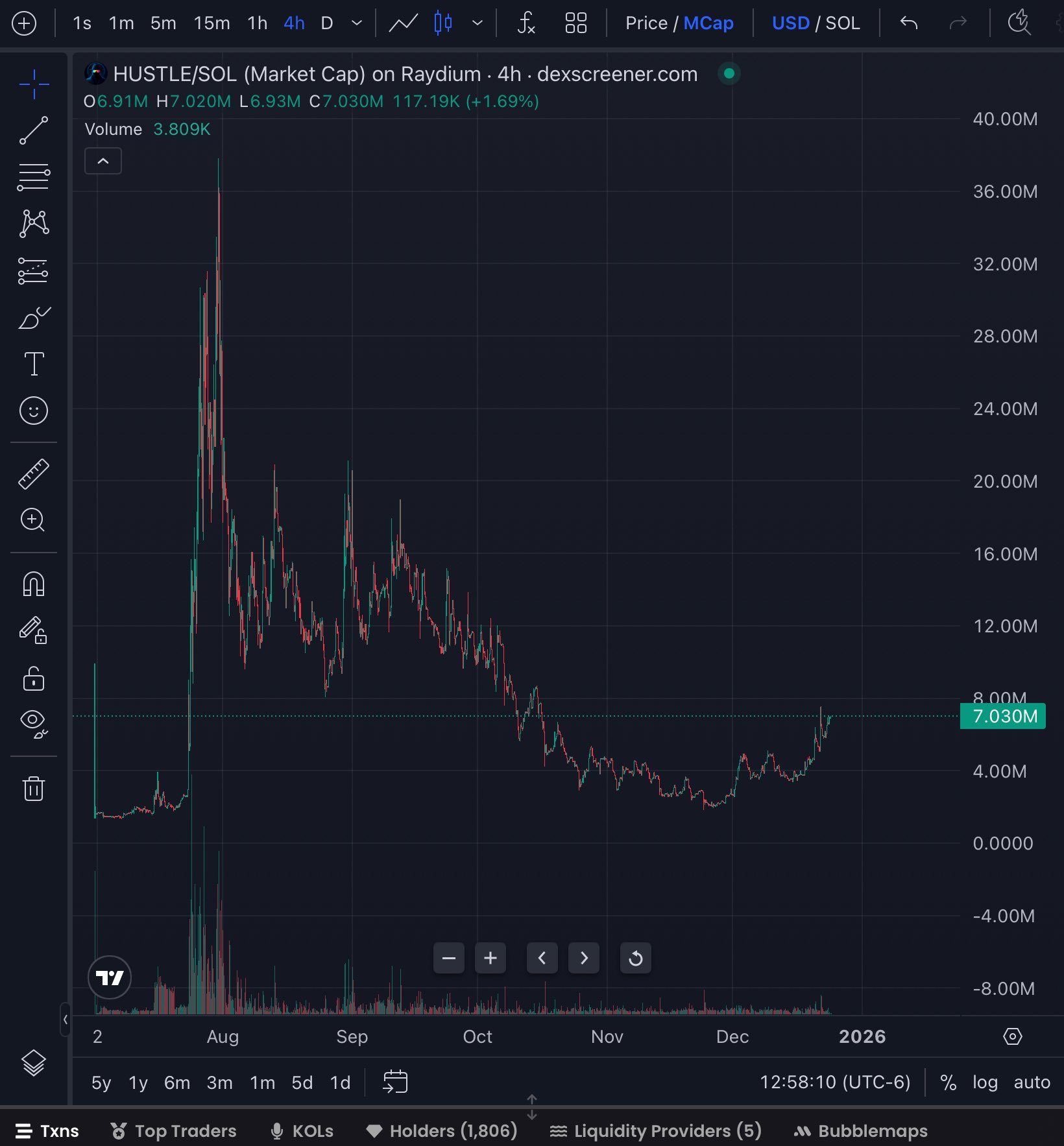 HUSTLE rose after forming a rounded bottom at a 2.5M market cap, the author believes it was a successful bottom pick.