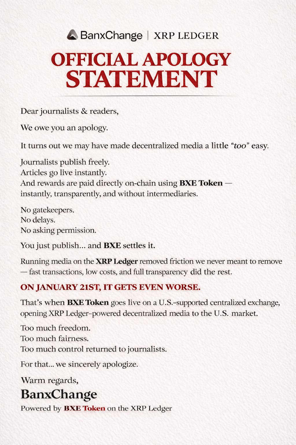 This partnership expands worldwide access to BXE, strengthens liquidity, and accelerates adoption of decentralized media built on the XRP Ledger through BanxChange.