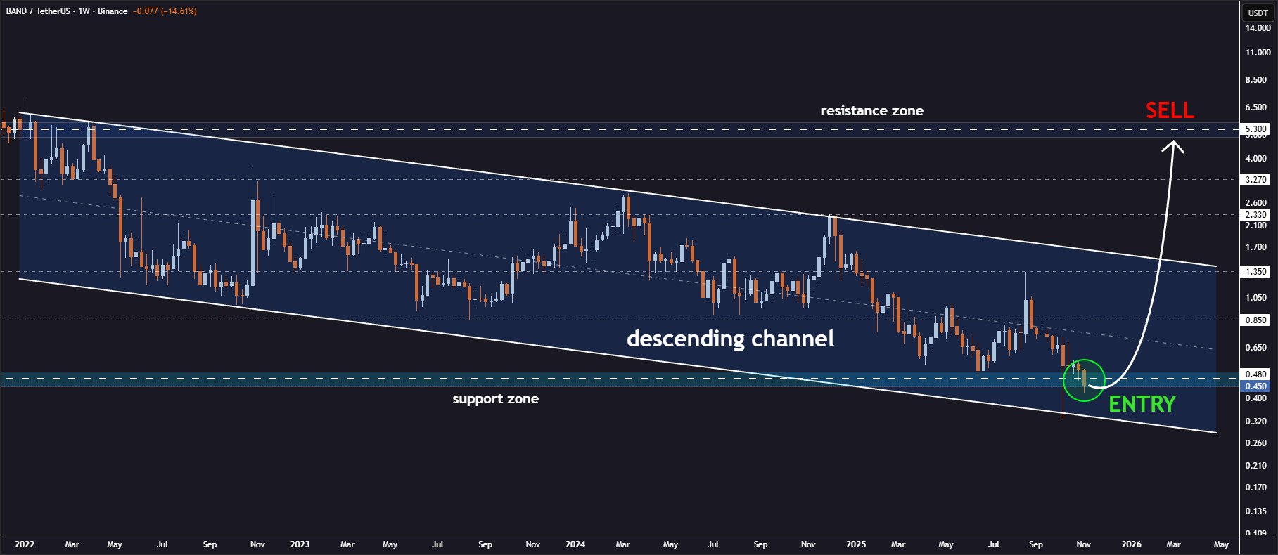 Jonathan Carter Technical Analyst Trader A9.04K @JohncyCrypto#BAND Descending Channel Bounce💁♂️ The setup: ✅ Approaching the descending channel’s lower border on the weekly timeframe ✅ Price consolidating near the support zone ✅ Bullish divergence signals confirmed Target levels: $0.85 → $1.35 → $2.33 → $3.27 → $5.30🎯 Smart money is positioning for the next leg up📈