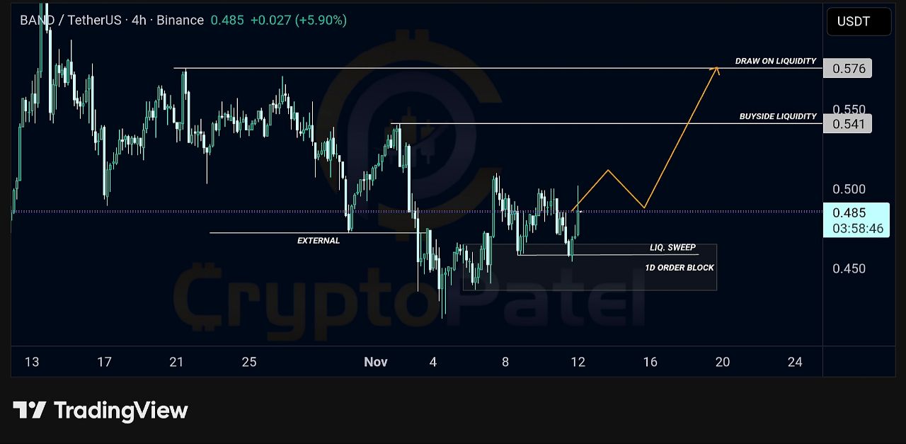 Crypto Patel TA_Analyst Influencer B54.66K @CryptoPatelClassic ICT Setup: $BAND Ready to Pump Sell-side liquidity swept, price tapped into 1D bullish OB, confirming market structure shift. Now in discount Zone: classic ICT model: Sweep → Displacement → OB Retest → Expansion Targets: 0.541 / 0.576 Smart money aiming for buyside liquidity. @BandProtocol #BAND