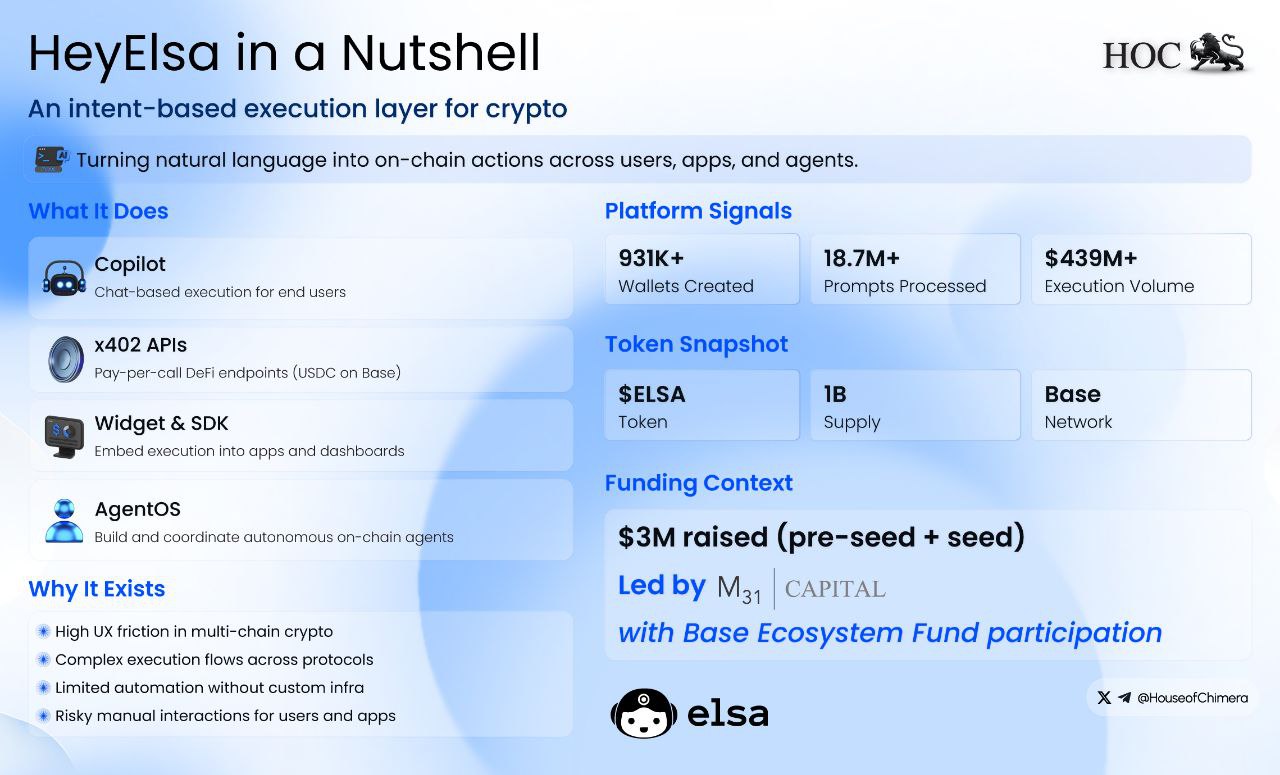 House of Chimera FA_Analyst OnChain_Analyst B47.28K @HouseofChimeraCurrent DeFi requires navigating multiple protocols, managing seed phrases, and manual yield optimization. 🔹 @HeyElsaAI thesis: abstract this complexity via AI agents that execute user intent autonomously. Does UX abstraction drive adoption? $ELSA https://t.co/NCHoosDoae