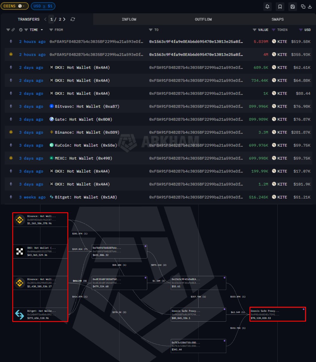 onchainschool.pro OnChain_Analyst Educator A6.03K @how2onchain$KITE MOVED TO TEAM WALLETS Over the last 2 hours, $KITE worth approximately $900K were transferred to two team wallets These tokens were withdrawn from multiple exchanges over the past 3 days and ultimately consolidated into the team wallets Additionally, 8 hours earlier, tokens worth $530K were transferred to a team wallet using the same flow Team wallets: 0x99Dc0b0E4Ec759159CA7412802684C48CD4bBB9a 0x9436B7a4b397C9A43A2fD2c75C41e826aceC0852