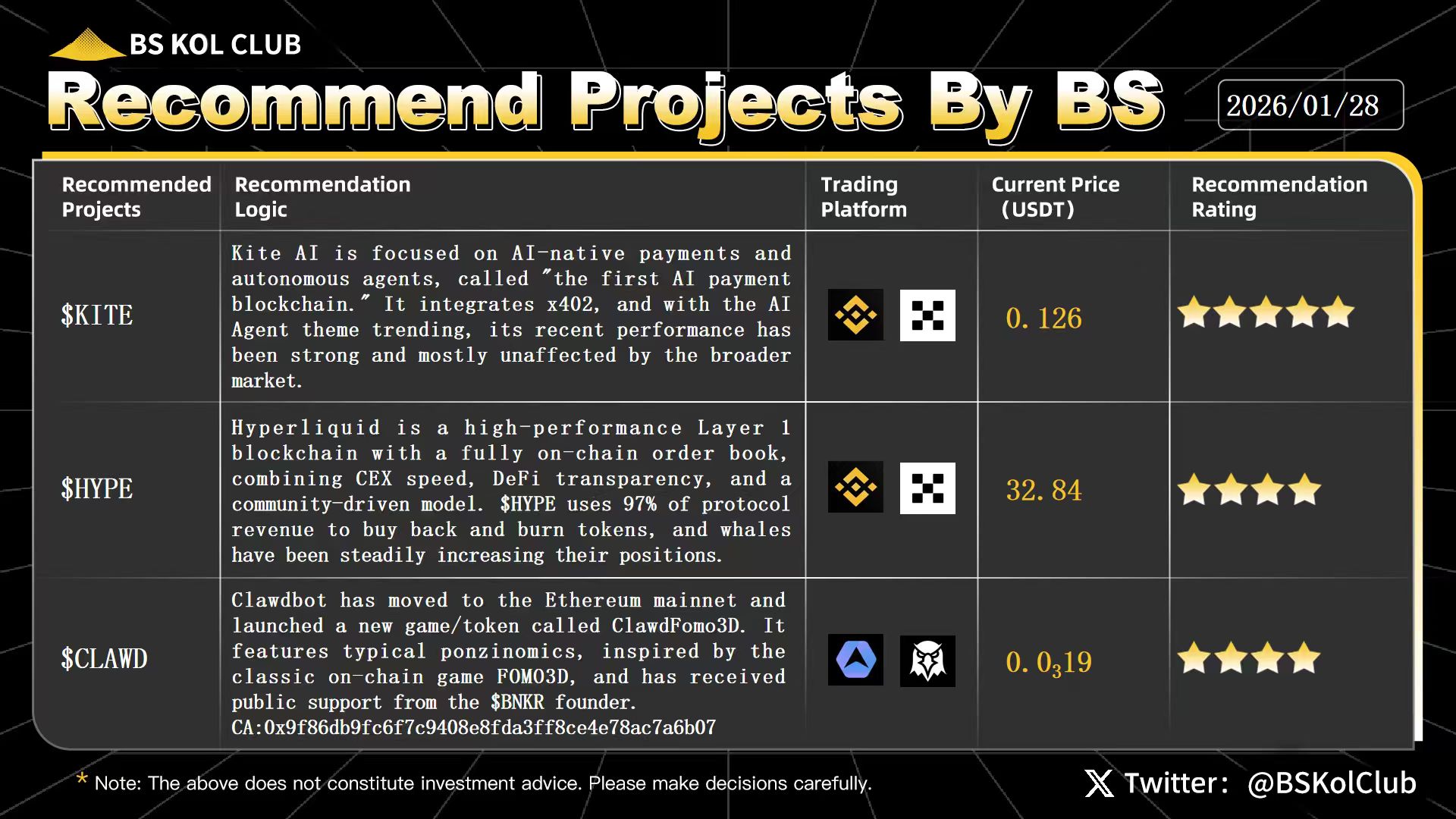 26 5 2.67K Original >Trend of KITE after releaseBullishBS KOL Club recommends KITE, HYPE, CLAWD, and warns of Bitcoin volatility risk during the FOMC meeting.