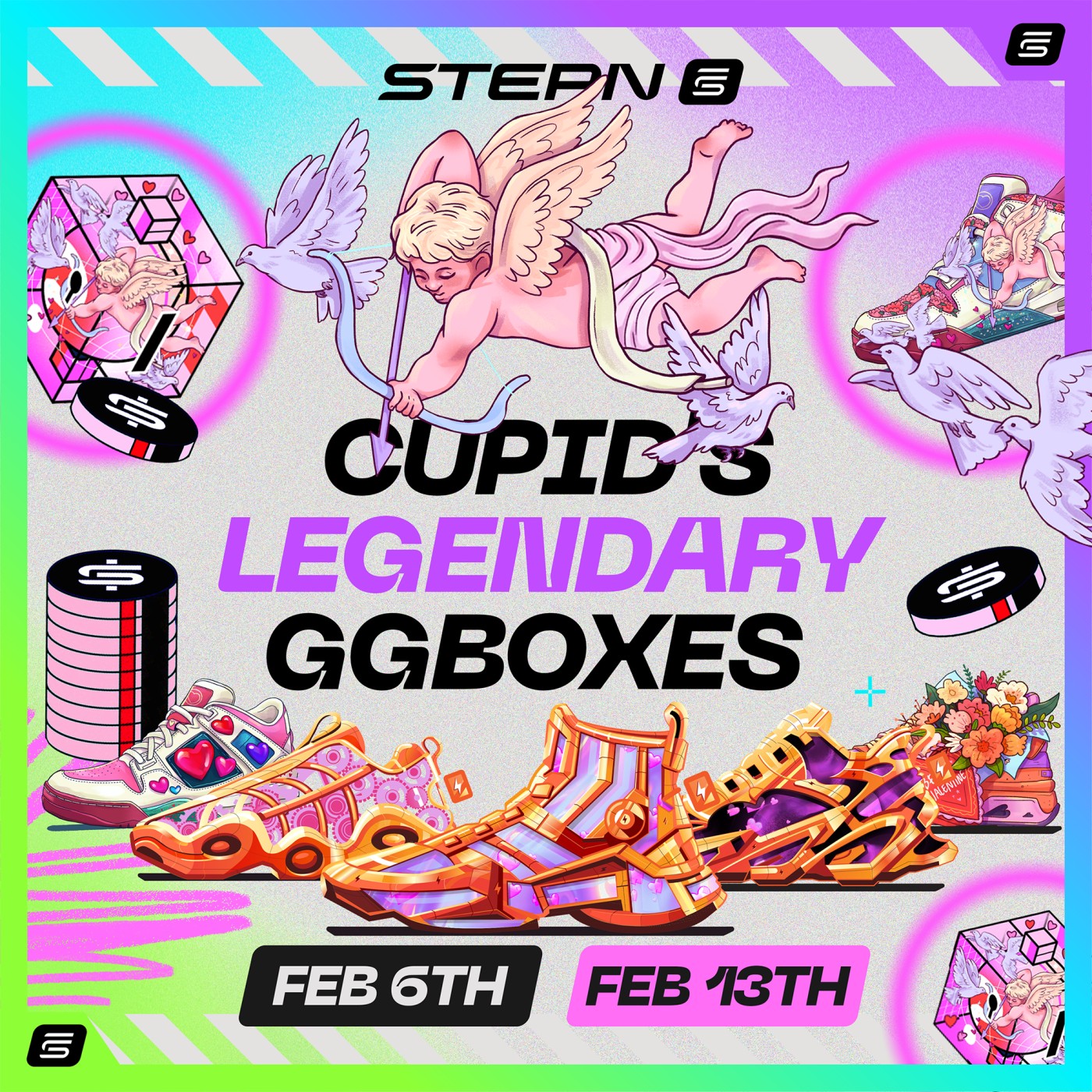 Stay active in STEPN and STEPN GO to earn Cupid’s Legendary GGBoxes, which have hiding inside Valentine Legendary STEPN Sneakers, GGUSD rewards, and more 🎁
