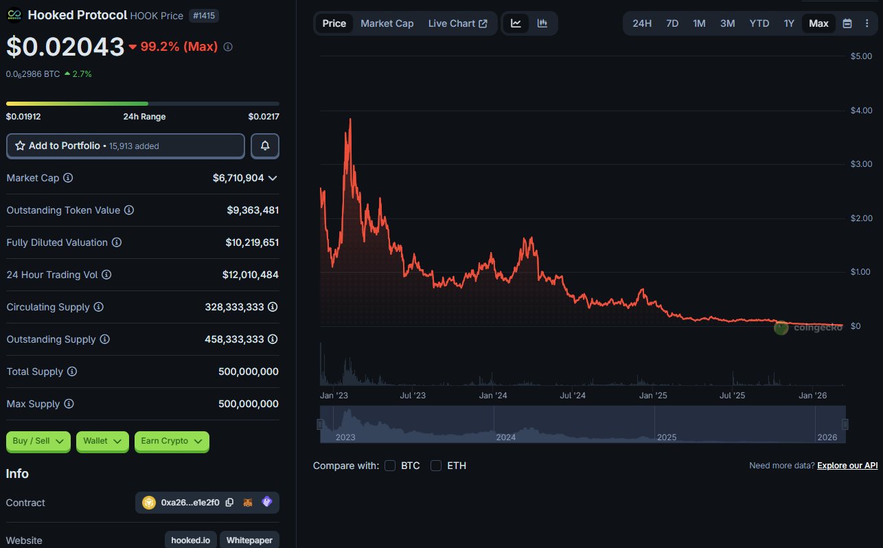 - Resumen$HOOK fell to $0.02, three‑year continuous decline, lacking use case, heavy vesting, reward model failure, low user activity.
