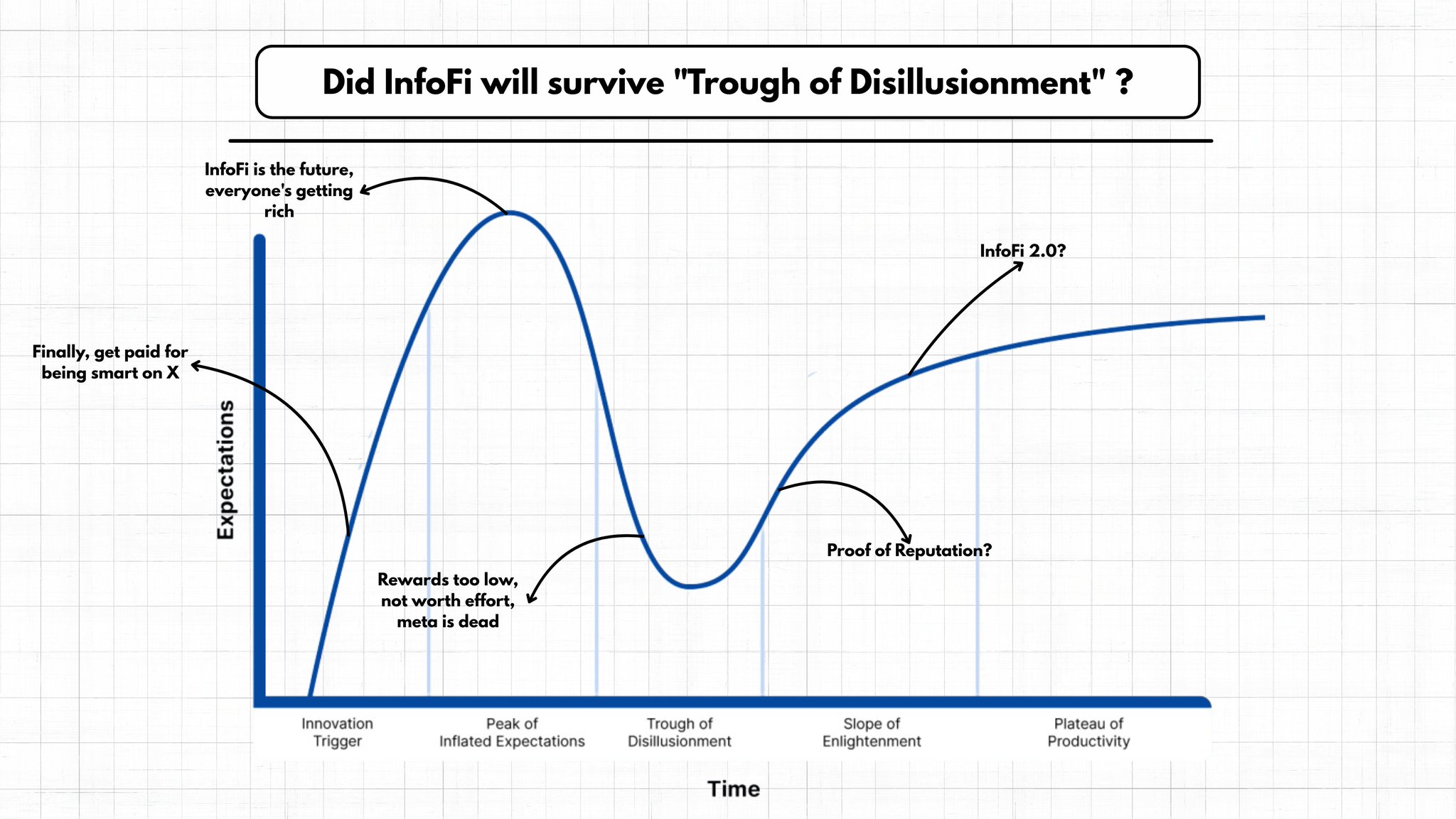 Zamza Salim Influencer Educator B54.29K @Autosultan_teamDid InfoFi will survive "Trough of Disillusionment"? Yoooo GM CT, if you've been farming InfoFi & wondering why rewards just nosedived 80-90%, you're not alone. We just hit the "Trough of Disillusionment" & it's brutal out here ➥ Let's break it down through The InfoFi Hype Cycle🧵 ① Phase 1: Innovation Trigger (Early 2024 - Mid 2024) Kaito AI launched as "Bloomberg of Crypto." Proved attention can be indexed & rewarded. Early users crushing it with high-value airdrop. Low noise, high signal, strong reward. Everyone's said "finally, get paid for being smart on Twitter" ② Phase 2: Peak of Inflated Expectation (Mid 2024 - Early 2025) Kaito clone exploded everywhere, Cookie3, Layer3, Galxe, Wallchain, all promising reward for posting. KOL making thousands just yapping. Everyone rushed in. But then the slop started, people gaming algorithm with ChatGPT-generated "professional analysis." Feed flooded with AI garbage. Still, sentiment was "InfoFi is the future, everyone's getting rich." ➂ Phase 3: Trough of Disillusionment (Mid 2025 - Present) WE ARE HERE ✦ What happened? • Reward slashed 80-90% • Signal-to-noise ratio collapsed • Projects realized they're paying for AI slop & bot, not real engagement • Platforms updated algorithms hard (anti-farming, quality filters) • Real users caught in crossfire with lower scores • ZachXBT & others exposed InfoFi as "coordinated attention farms" • Sentiment flipped "Rewards too low, not worth effort, meta is dead" Why it crashed? Bot outnumber humans 10:1. Low-quality AI content everywhere. Engagement farming killed the signal also Projects max extracted at TGE. Community trust broken ✦ Token price nuked too: • $KAITO peaked ~$2.9 Feb 2025, now ~$0.60 • $COOKIE peaked ~$0.84 Jan 2025, now ~$0.05 • Most InfoFi tokens down 70-80% • Visibility dropped 30-40% on X for InfoFi accounts What Happens Next? The Recovery Phases? ➃ Phase 4: Slope of Enlightenment (Late 2025-2026) ✦ Most Kaito clones die. Survivor shift focus, • Stop rewarding volume, start rewarding conversion (did your post actually drive action?) • Reputation-based systems (only high-quality accounts with real followers earn) • Anti-bot measures everywhere • Rewards tied to real utility, not just posting ✦ Projects evolving? • Kaito shipping anti-slop filters • Cookie/MindoAI updating algo for quality • Platform requiring Proof of Reputation • One quality thread from trusted account > 100 bot replies ➄ Phase 5: Plateau of Productivity (2027+) ✦ InfoFi becomes real utility, • Embedded in Web3 workflows • Information as reliable asset class • AI agents creating verifiable markets • Rewards stabilize at sustainable levels • Focus on value creation, not farming ✦ What Changed? • Then (Peak) » Now (Trough) • Sharing alpha/insights » Task execution/points farming • Original quality content » AI slop everywhere • Life‑changing airdrops » Pennies with high gas fees • Engagement‑based algo » Bot‑detection threshold • Subject matter experts » Mercenaries & bot If You're Still in InfoFi, Here's The Move: ✦ STOP • Posting 20x/day (flag you as bot) • Using AI to generate slop • Farming volume over quality • Chasing every platform with low rewards ✪ START • Focus on reputation (X scores) • Build with platforms that survived (Kaito, Cookie, MindoAI, Wallchain, Xeet) • Create original insights that drive actual conversions • Target "Smart Follower" engagement over bot likes • Wait for Phase 4 recovery with better systems Conclusion? Easy money is gone. InfoFi isn’t dead, it’s evolving. The platforms that survive will reward quality & reputation, not spam & volume Most people will quit now (good, less competition). Smart people will adapt & position for Phase 4 when systems improve Your Choice? Quit and move on (totally valid) or Adapt strategy for quality‑focused InfoFi 2.0 The nuke phase suck, but every hype cycle goes through this. But the question is "will you be positioned when it recovers?"