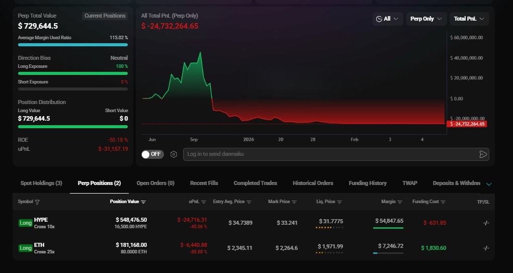 Right now, his whole book is hanging by a thread. Total perp exposure is sitting around $729K, 100% long, margin usage pushed past 115% —..which already tells you how thin the ice is.