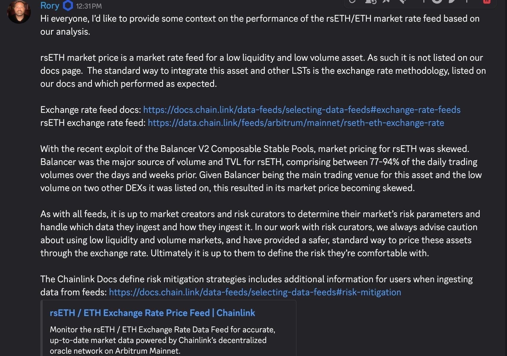 See Rory's post here from Discord, which goes into more details about the Balancer exploit that had an effect on the volumes of the delisted market rate feed, and a reminder about standard best practices to not use delisted, low volume, low liquidity feeds in your DeFi protocols.