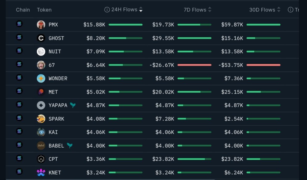 Here's a breakdown view of all tokens accumulating by smart money across Solana ecosystem (24-hour inflow).