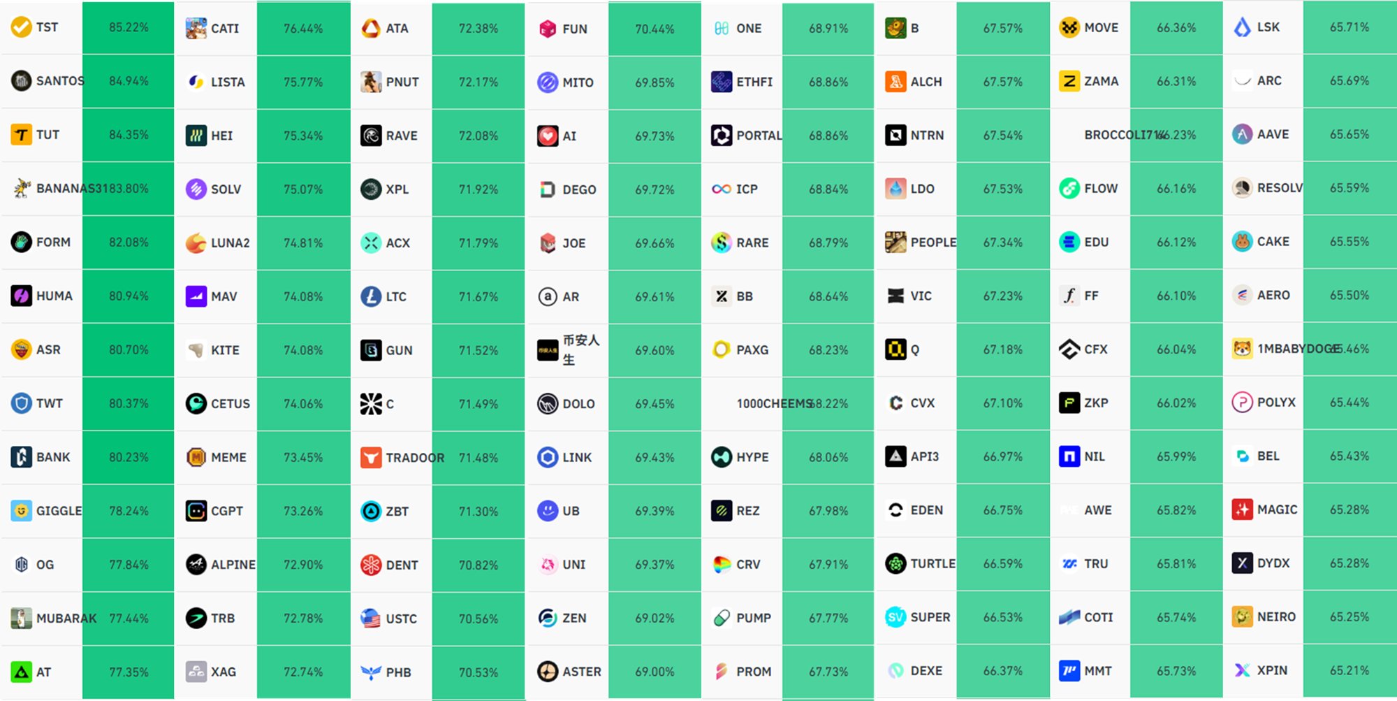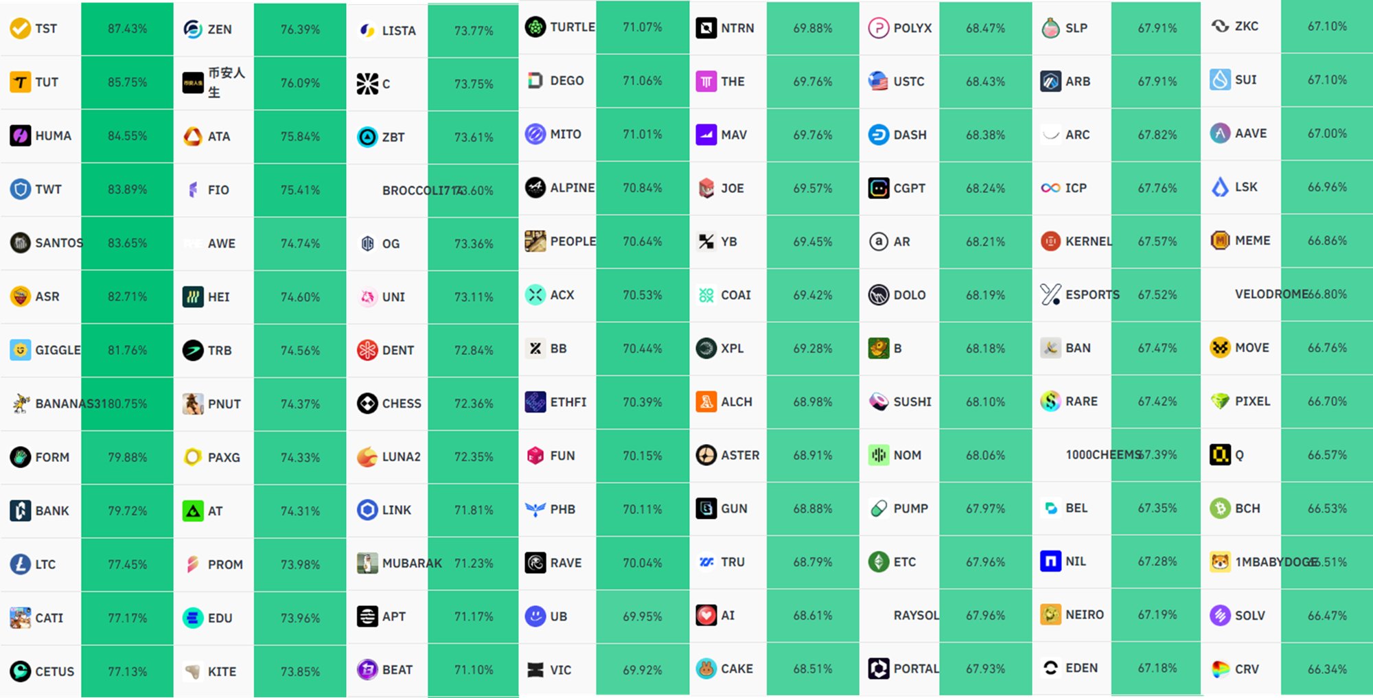 Binance top traders are extremely bullish on $TST, $TUT, $HUMA, $TWT, $SANTOS, $ASR, and $GIGGLE. Their long positions exceed 80%.