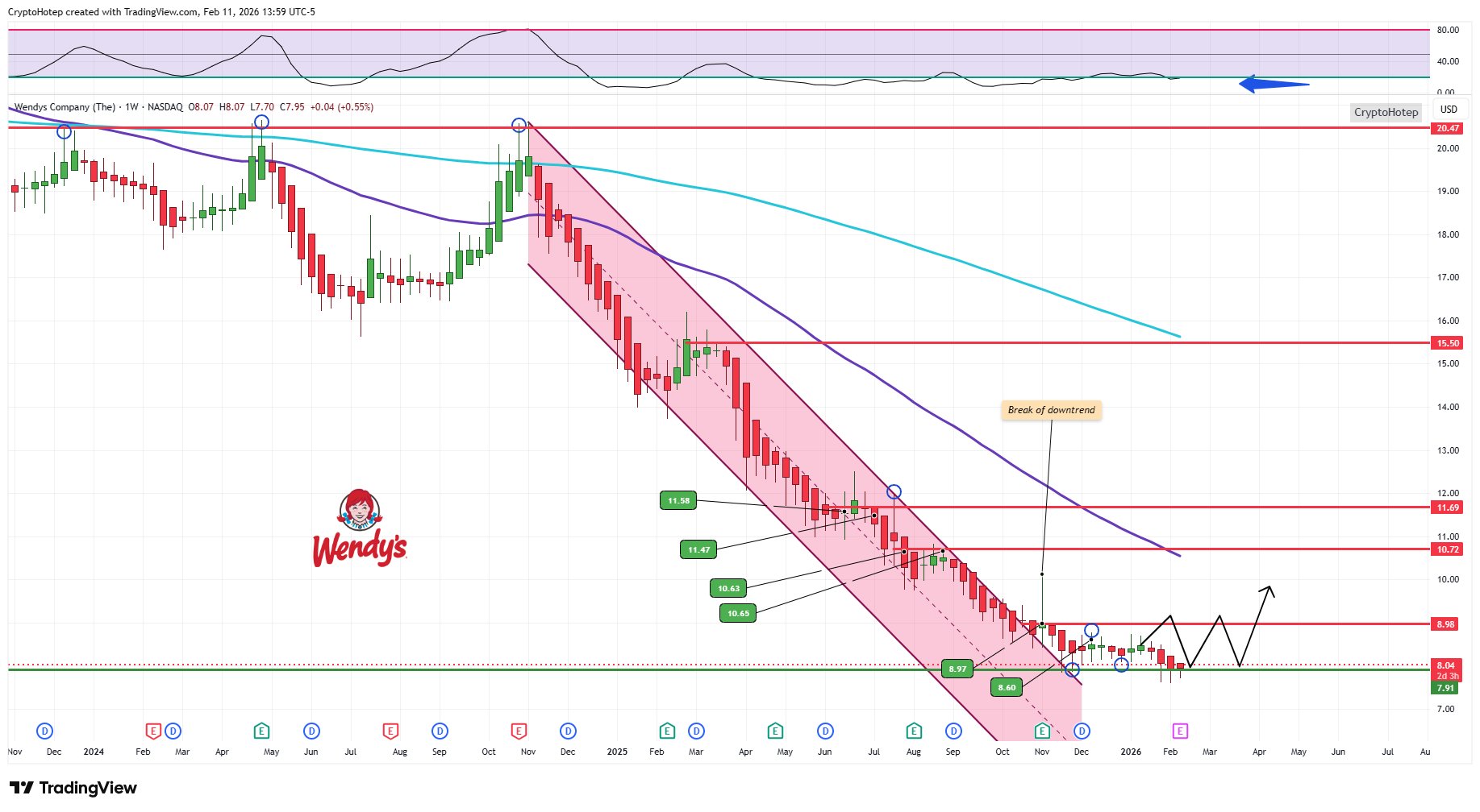 WEN price has stabilized at the $8 weekly support level and broken the downtrend, showing potential upward momentum.