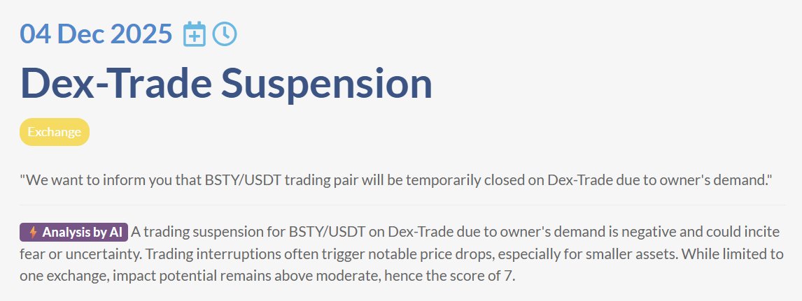 CoinMarketCal Media Researcher D111.09K @CoinMarketCalThree noteworthy events added in the last 24h ✨ $KAIA (@kaiachain) 04 Dec 2025 AlphaSec. Exchange 👉 https://t.co/67qkal8rEj $BSTY (@globalboost) 04 Dec 2025 Dex-Trade Suspension 👉 https://t.co/DcoarM1NqC $FLUID (@0xfluid), $XVS (@venusprotocol) 04 Dec 2025 Venus X & Fluid 👉 https://t.co/SFMFcjvcFs More highlights 👉 https://t.co/LhZzIYHOty