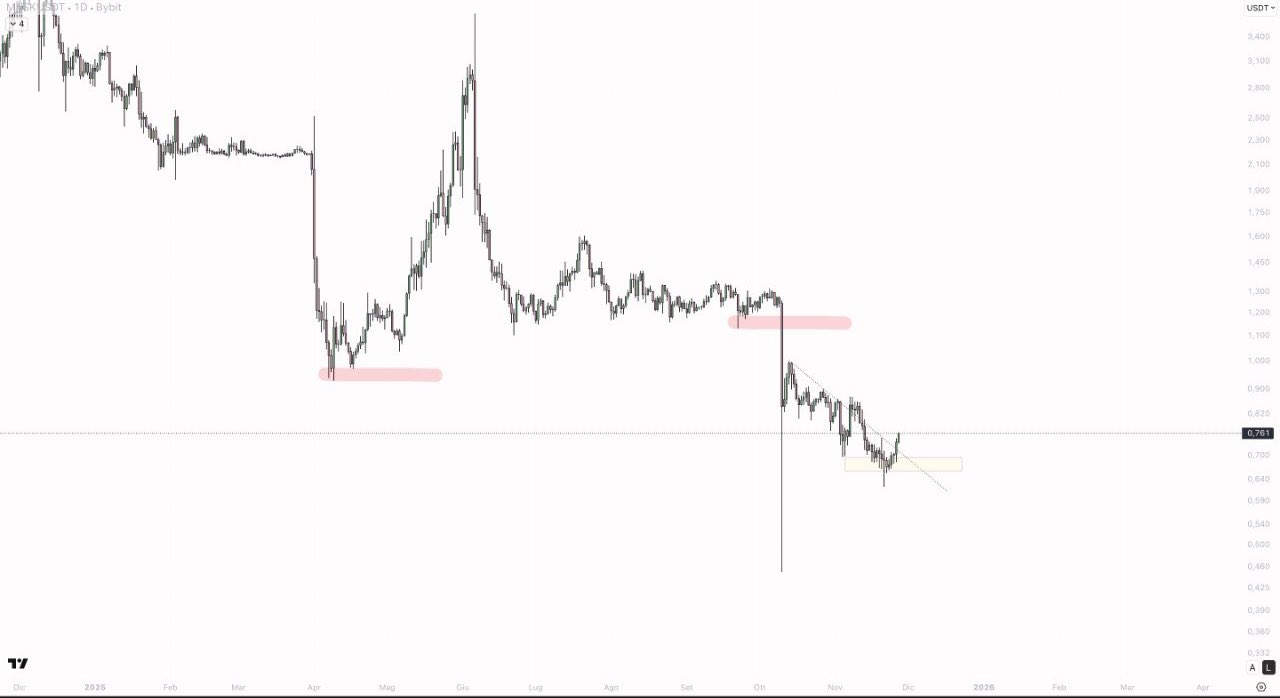 EliZ Trader TA_Analyst B597.81K @eliz883$MASK There are some coins (utterly useless, dead) that are beginning to show the first signs of a possible short-term structural shift. This is an interesting example: after a vertical dump and weeks of slow declines, the price has finally done something different it defended a small demand zone (the yellow box) and is trying to break the bearish trendline that has kept it trapped all month. When you see these dynamics, it simply means that selling pressure is no longer as dominant as it was. It's not yet a confirmed reversal, but it's the beginning of a build-up: more stable lows, deeper bounces, and above all credible attempts to reclaim lost levels. These are the assets I'm keeping an eye on in the short term: not because they're already bullish, but because they're the first ones that could change gear if the market stops pushing down. Extreme lows always show the first structures that anticipate the stronger moves. The risk here remains high, because there's still no confirmed reversal. We're only seeing the first signs, nothing more. The only advantage is that the invalidation is clean and immediate: if the price falls back below the box and loses that micro-level, the structure breaks and the setup no longer makes sense. It's an interesting short term play, but it must be treated with respect because we're still in a fragile overall trend.