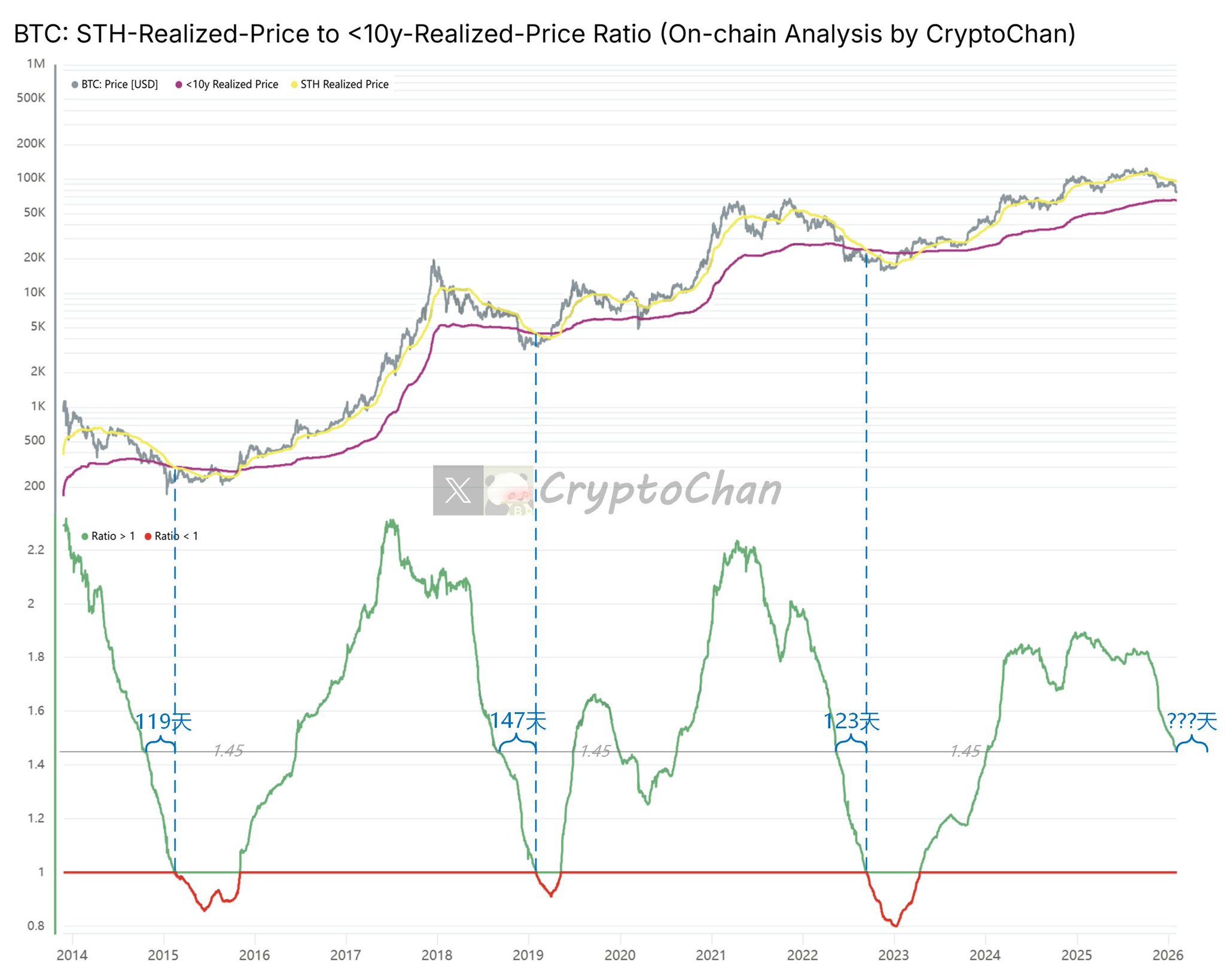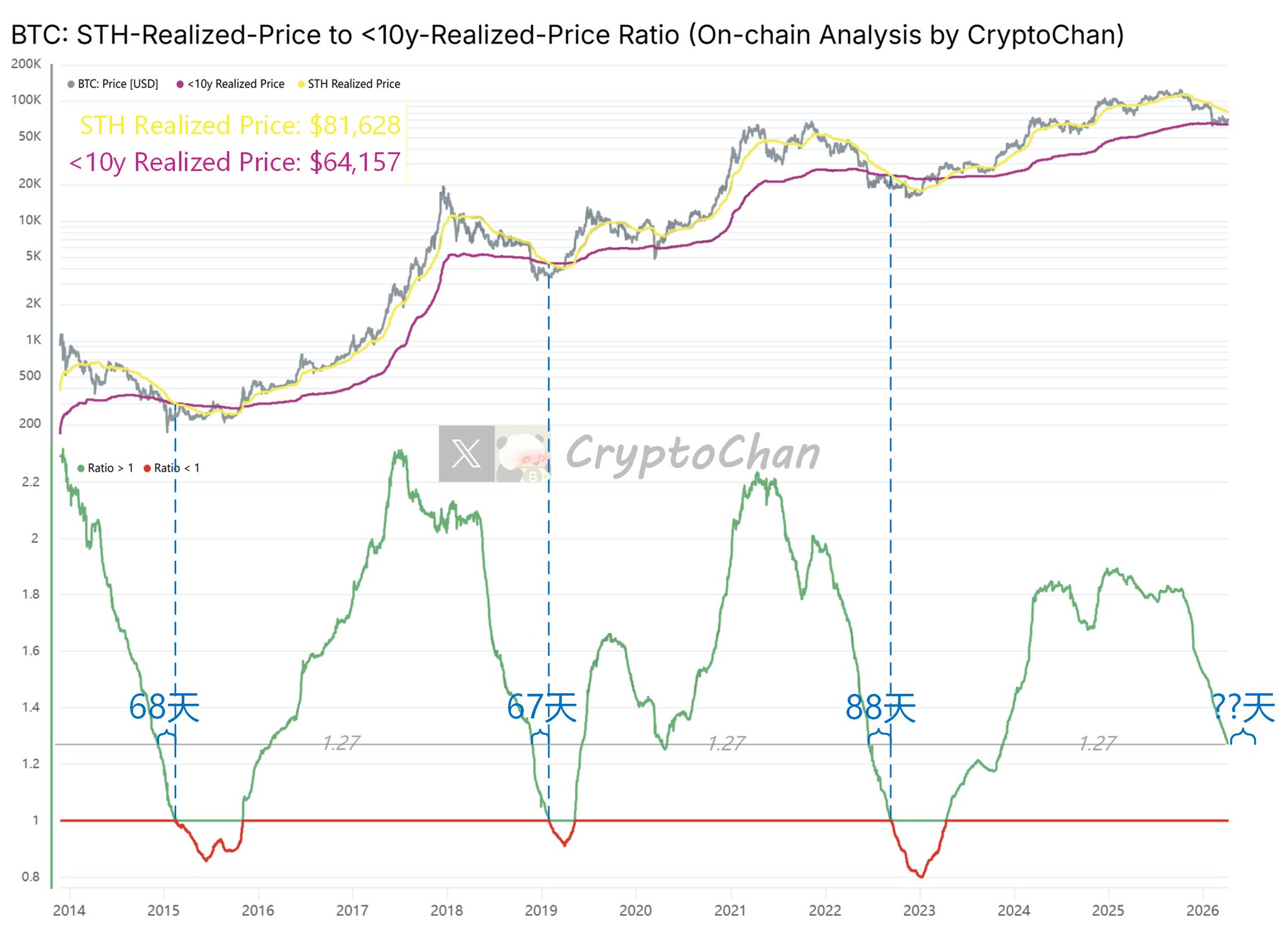 The lower part of the chart shows the ratio of “BTC short‑term holder average cost” to “BTC long‑term holder average cost (excluding >10y chips version)” (i.e., yellow line / magenta line)