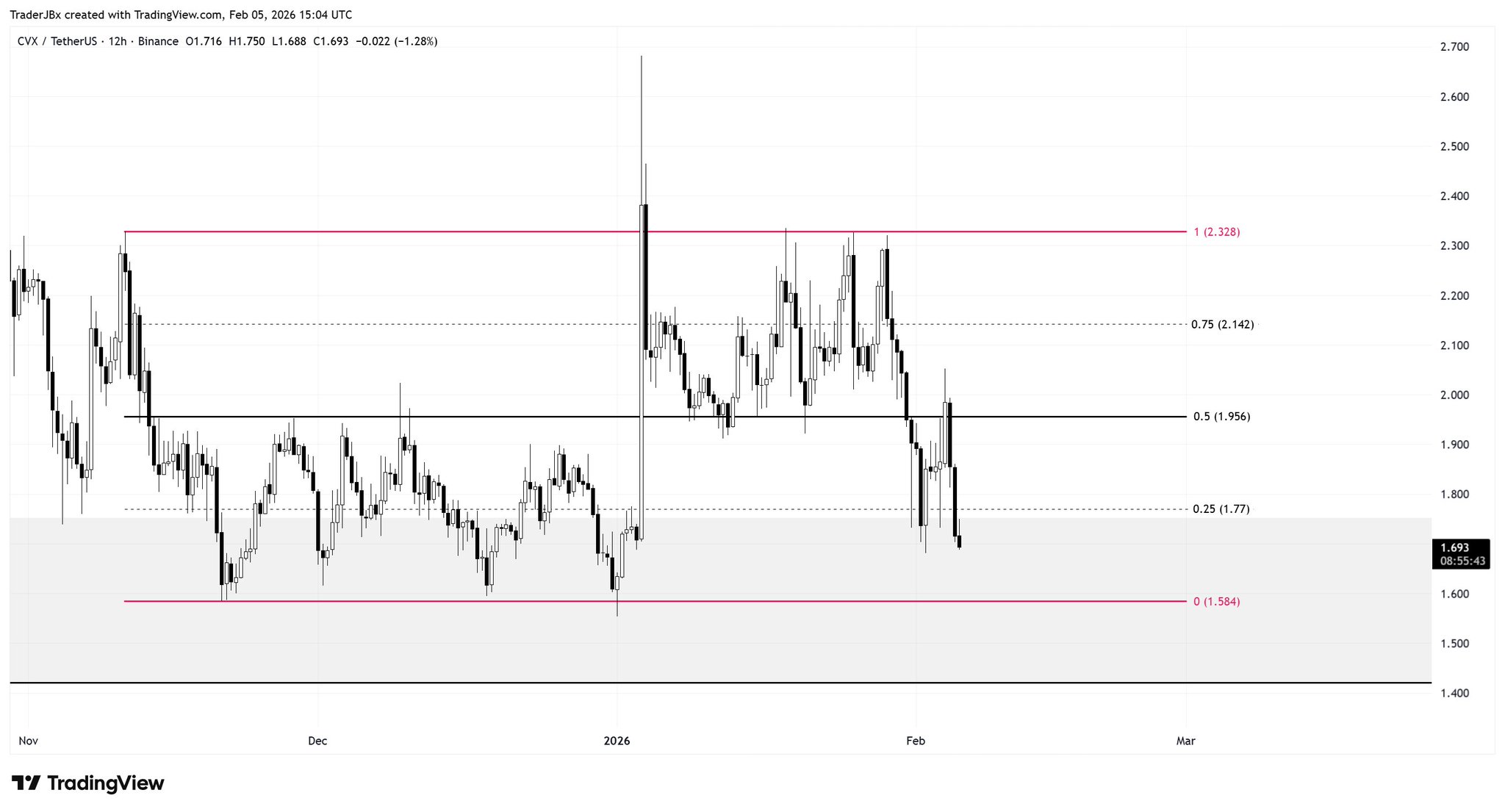 Exactly. It's encouraging to see that $CVX is holding up exceptionally well in these tough market conditions, so it's far from unreasonable to expect a strong pump once broader momentum shifts. Price gave way at $1.95, but we're still within the local range—which continues to act as an accumulation zone—and the key gray demand area is still holding.