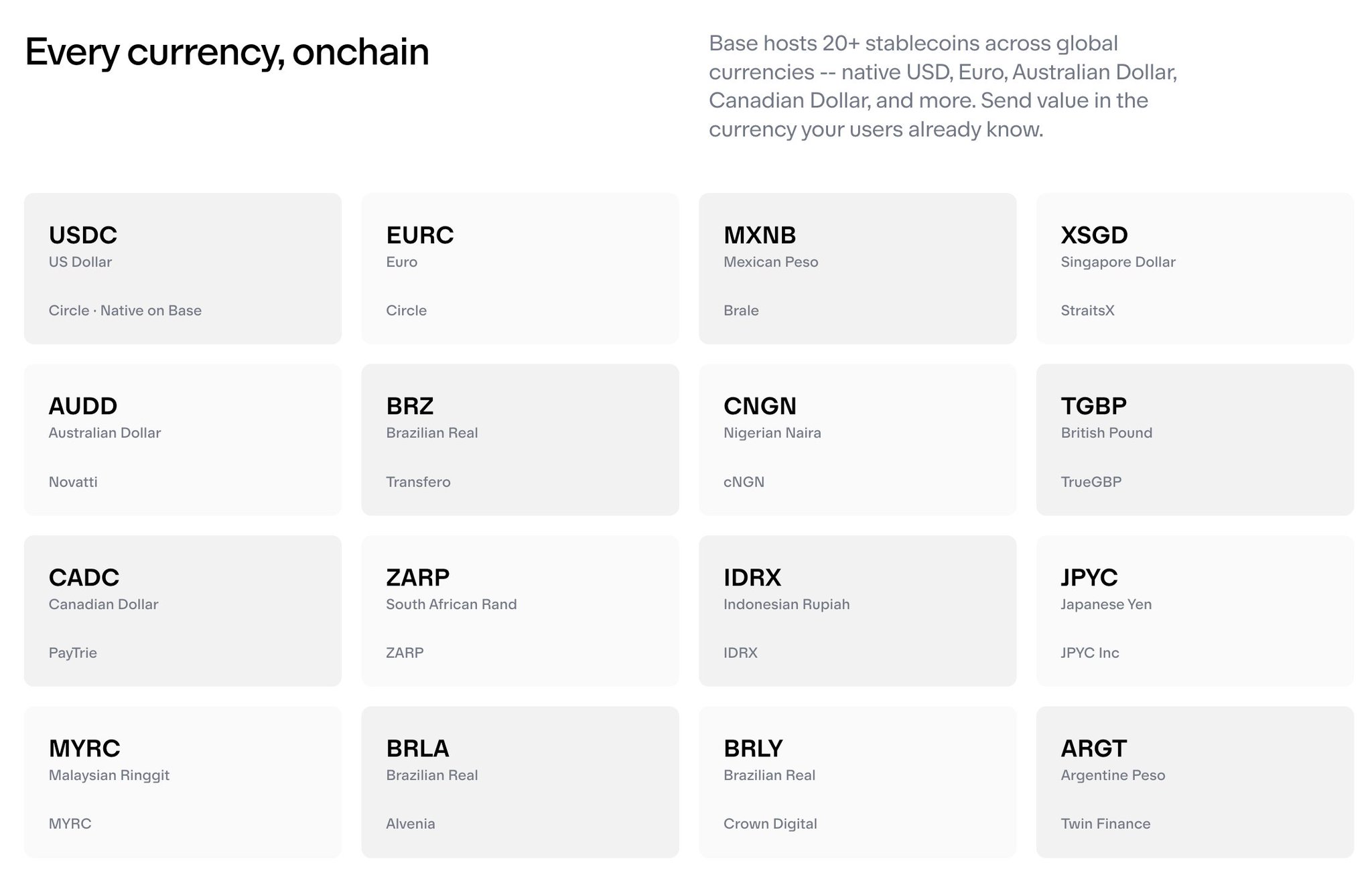 Base platform now supports more than 20 global fiat stablecoins, greatly expanding its on-chain currency ecosystem.